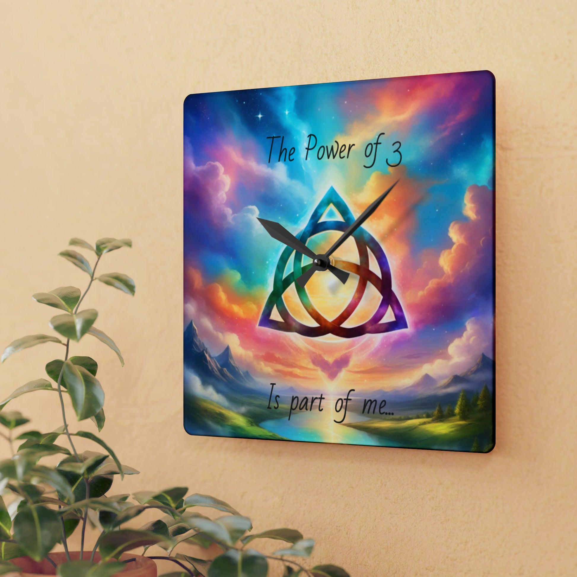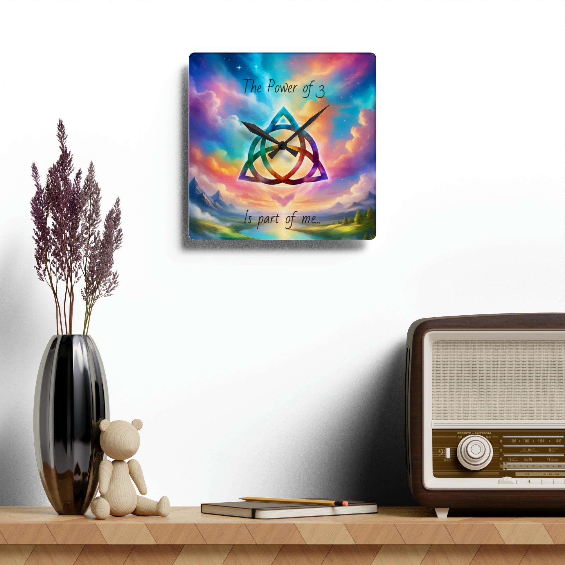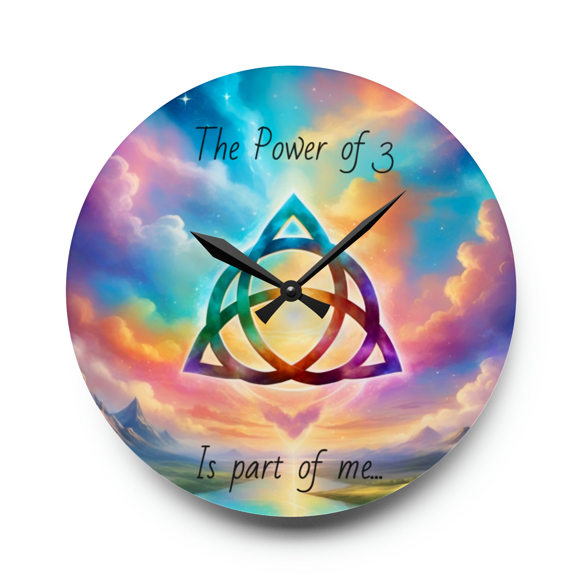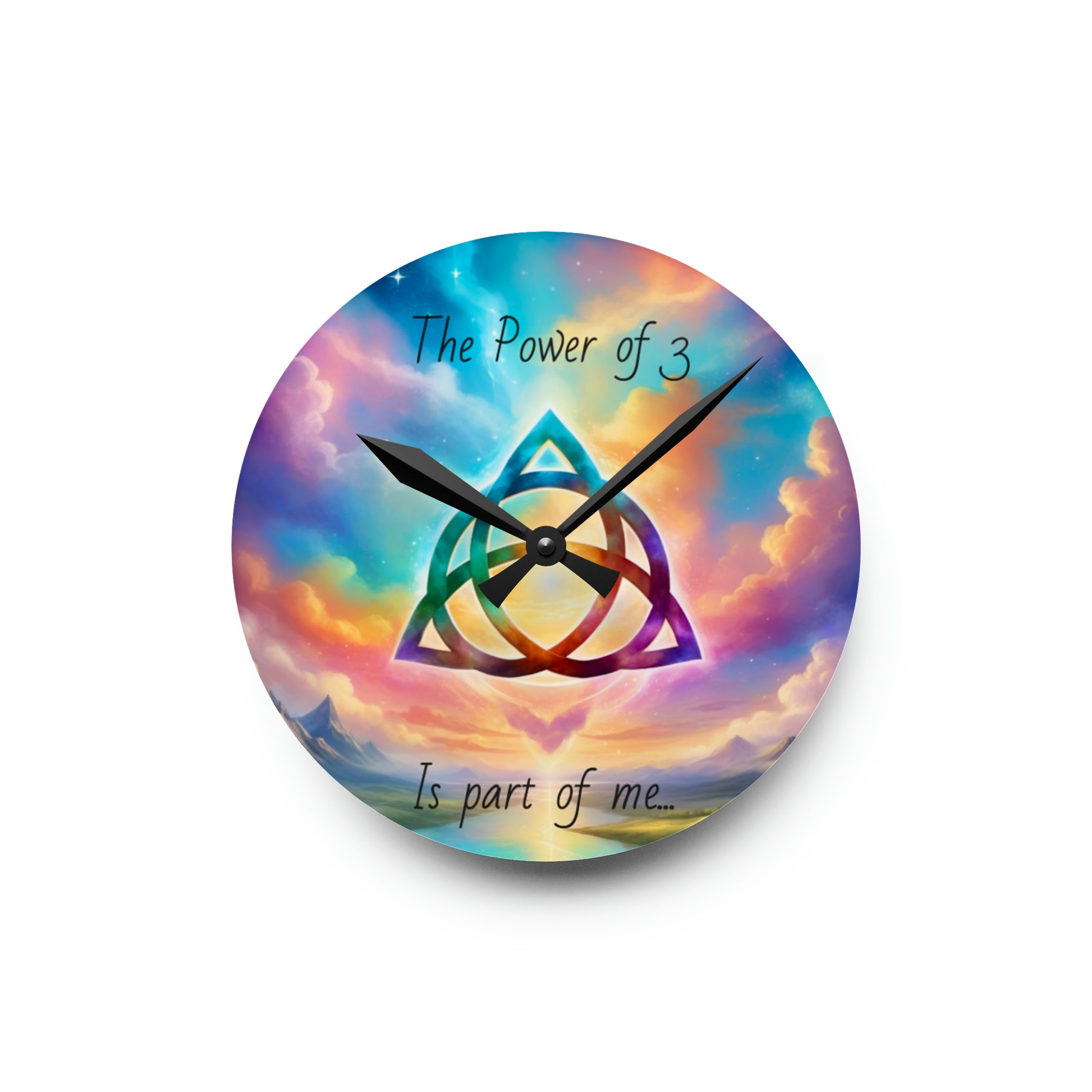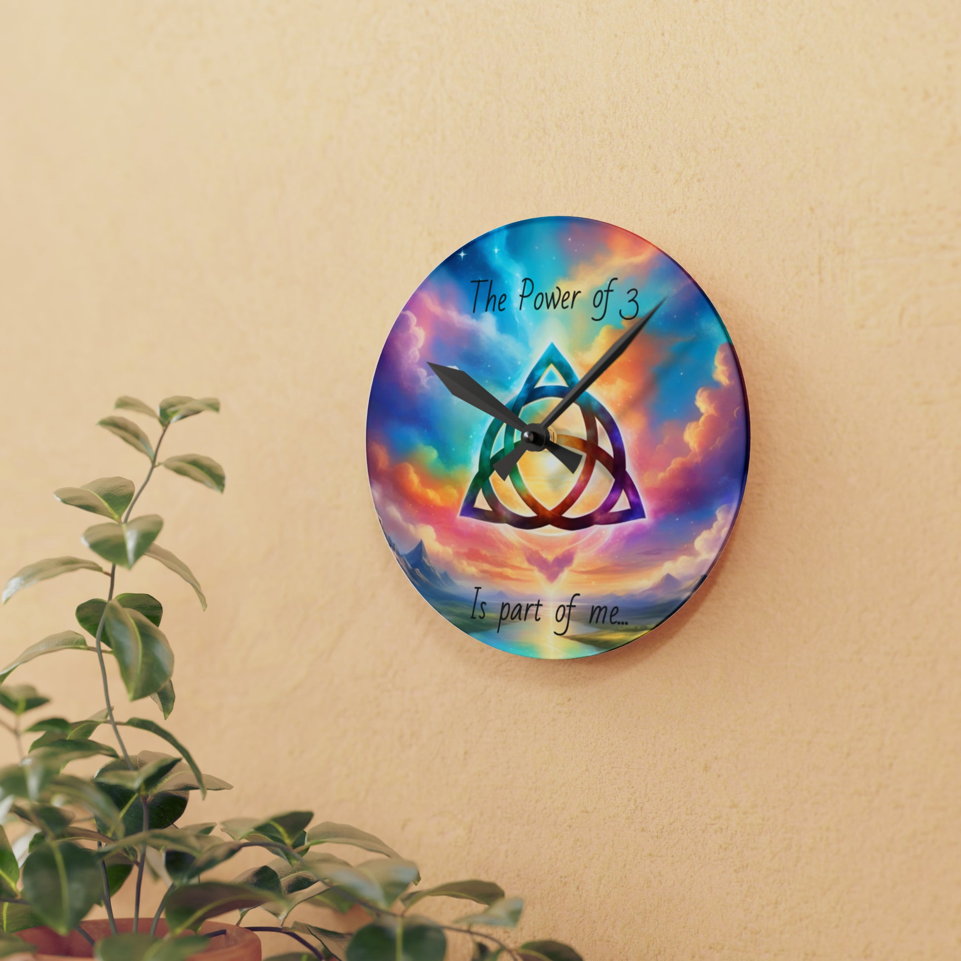 Acrylic Wall Clock, the power of 3 is part of me affirmation, brightly coloured sky with a triquetra symbol on it.