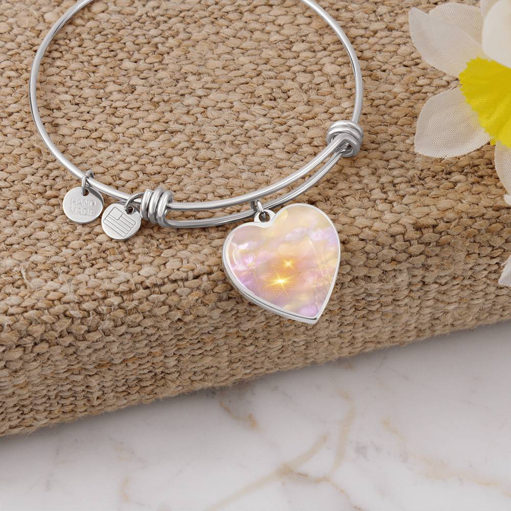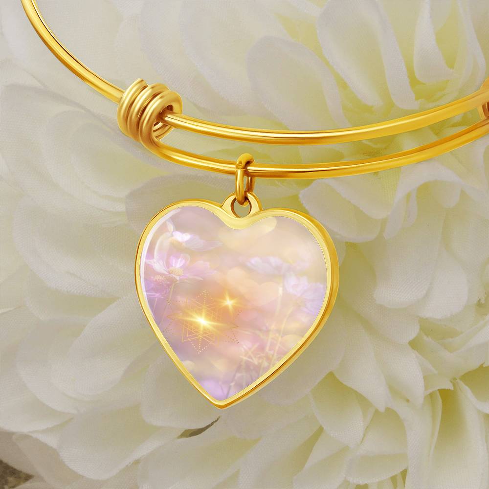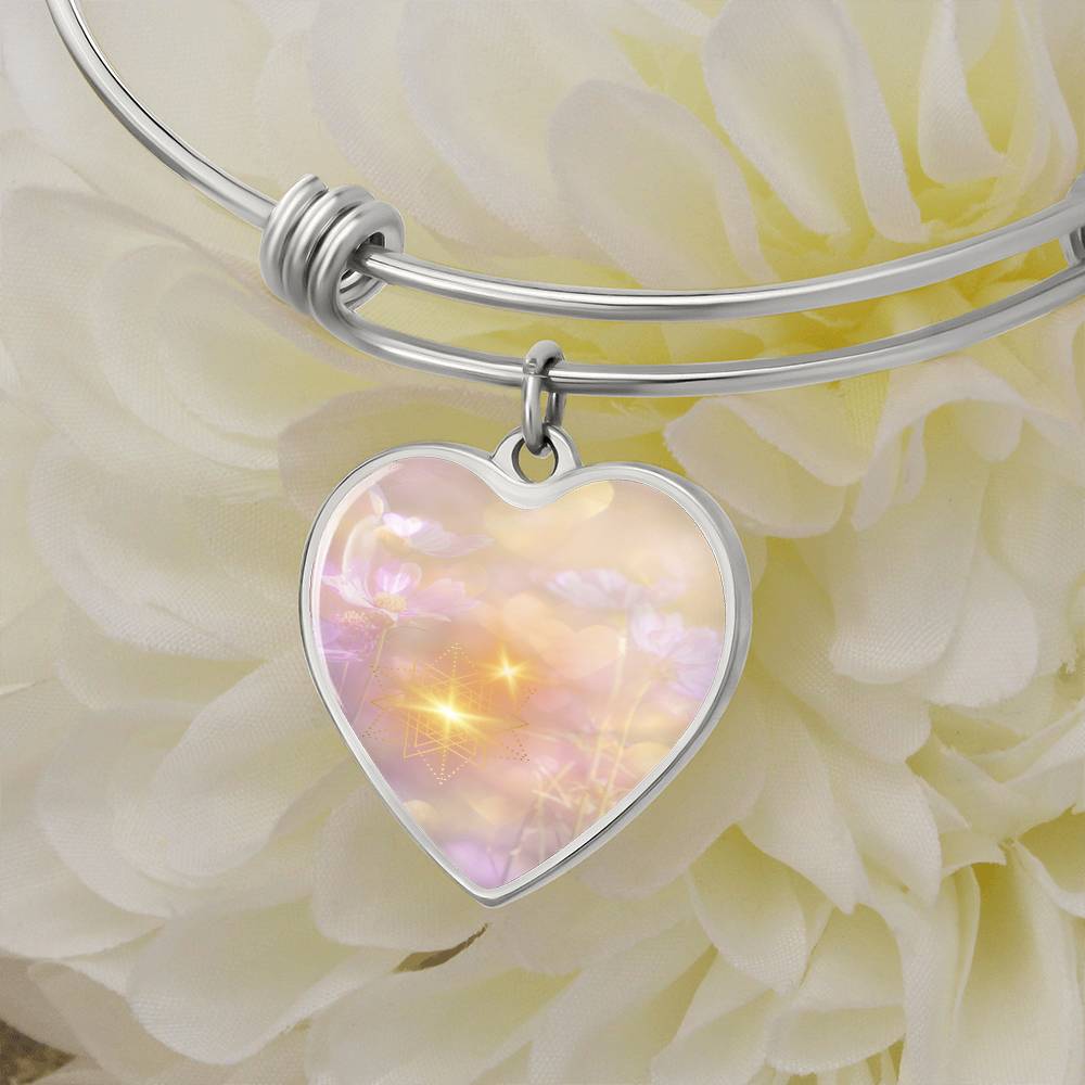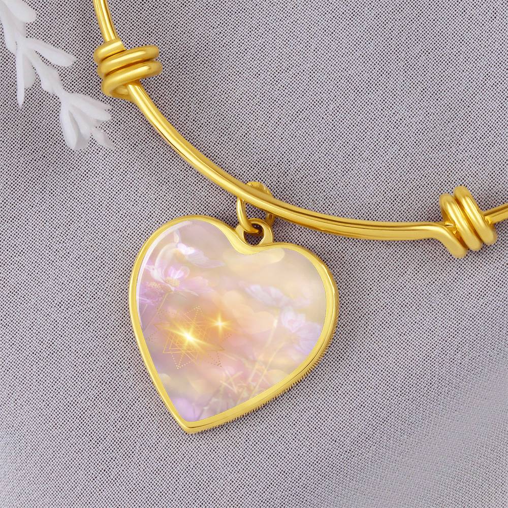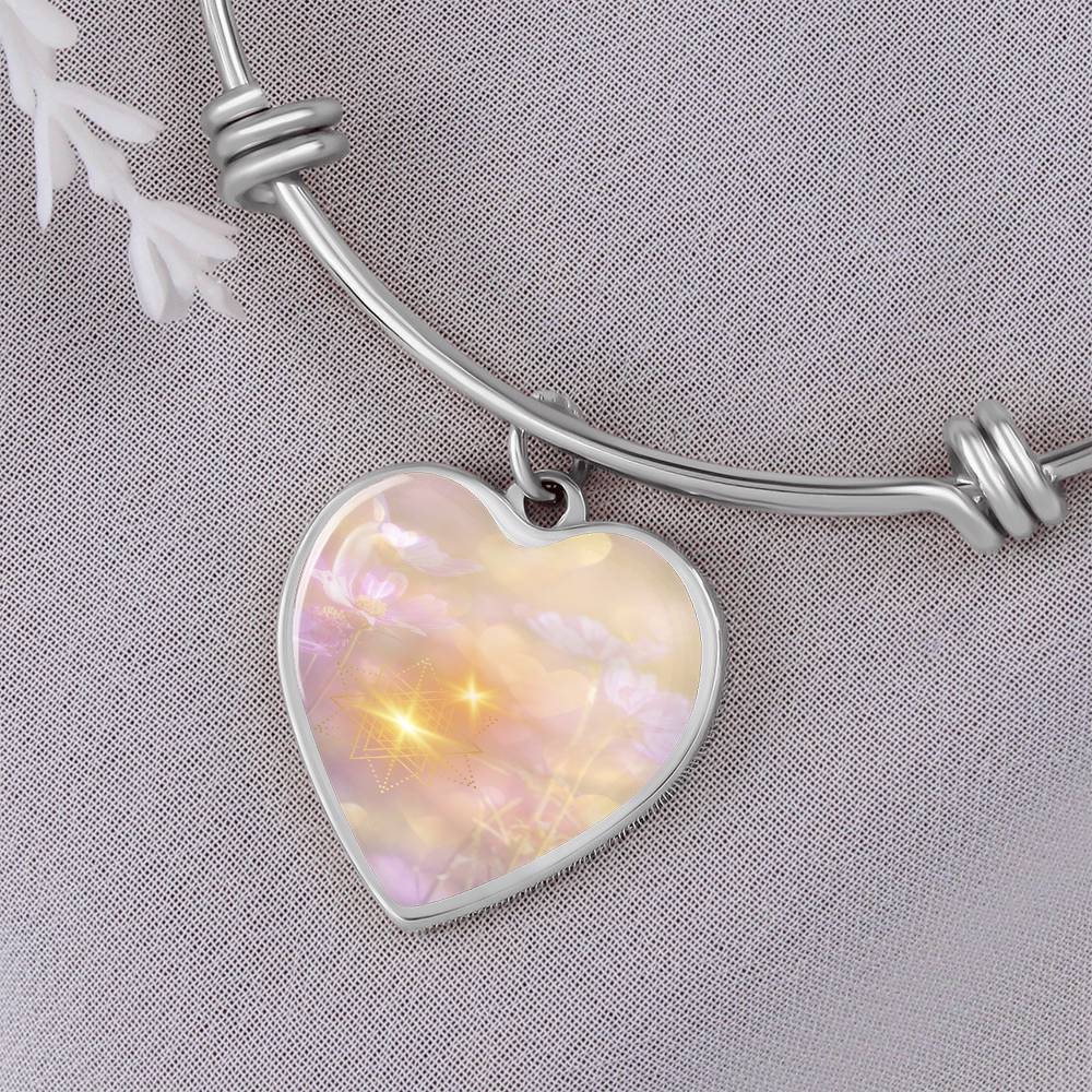 This beautiful bracelet is so much more than a pretty piece of jewellery. The unique heart charm dangles and shimmers with movement and is created with original energetic artwork that contains channeled light codes that are meant to help you access the energies of "your assured success leads the way".