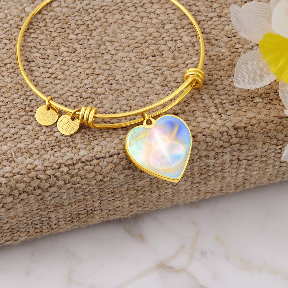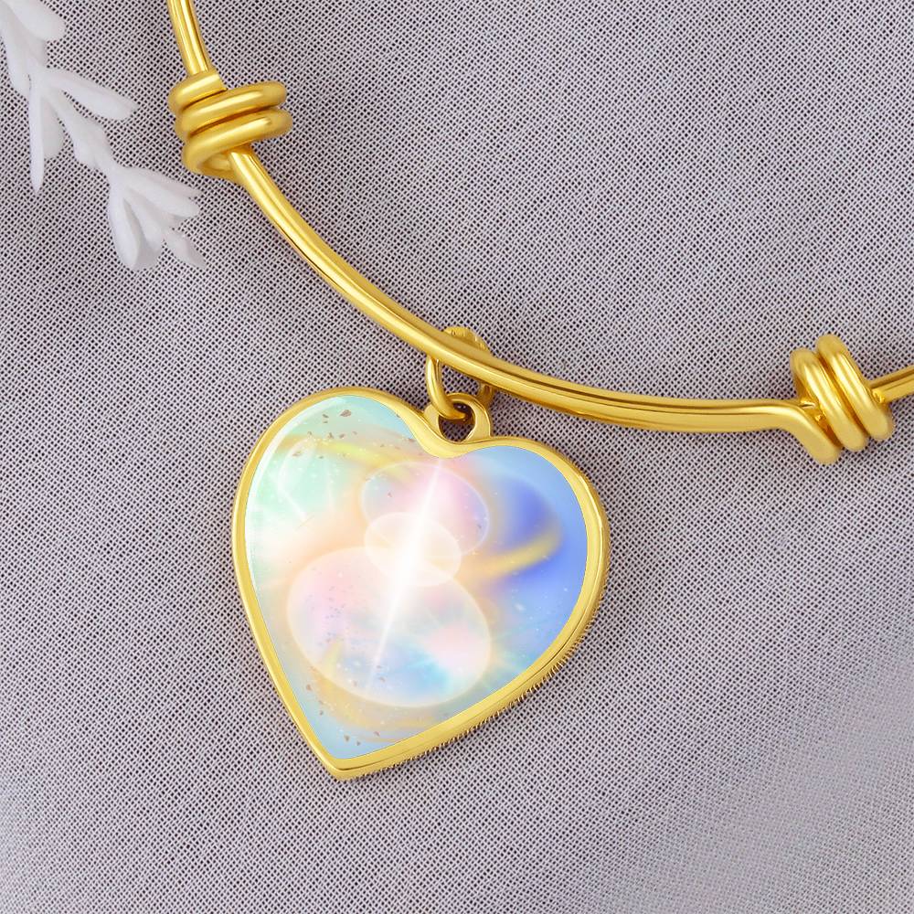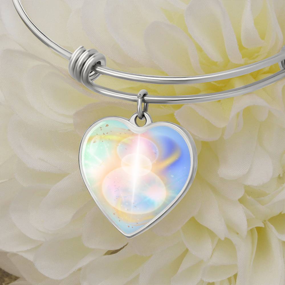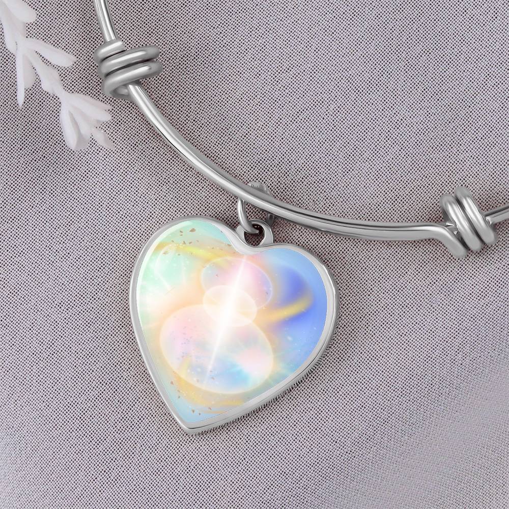 This beautiful bracelet is so much more than a pretty piece of jewellery. The unique heart charm dangles and shimmers with movement and is created with original energetic artwork that contains channeled light codes that are meant to help you access the Strength, resilience & Protection