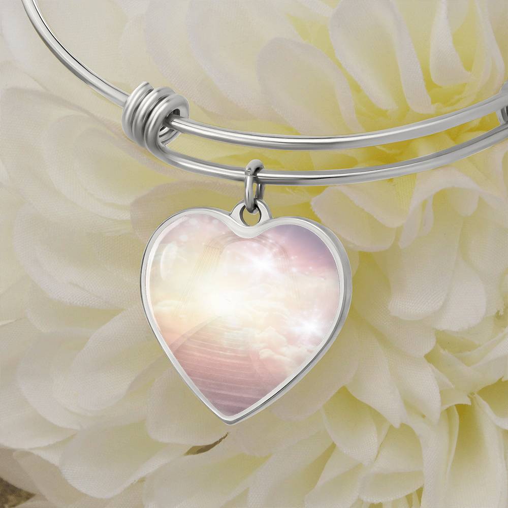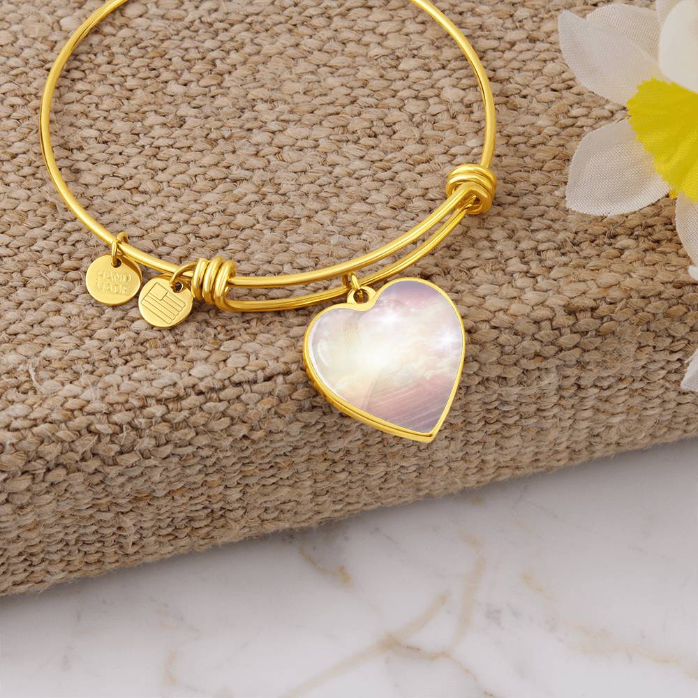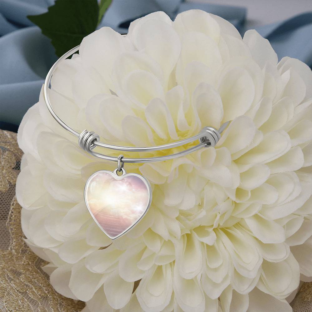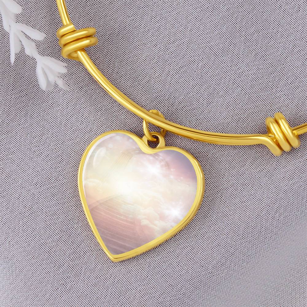 This beautiful bracelet is so much more than a pretty piece of jewellery. The unique heart charm dangles and shimmers with movement and is created with original energetic artwork that contains channeled light codes that are meant to help you access tHeaven on Earth.
