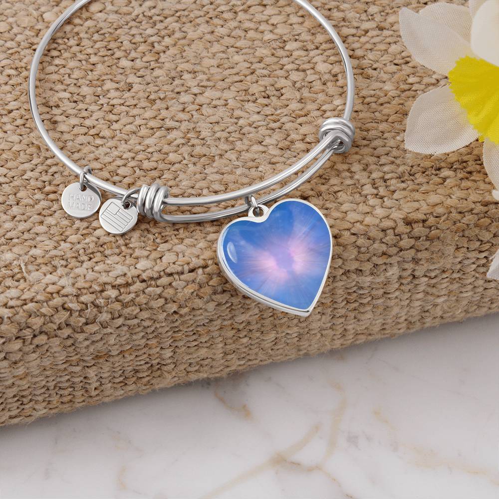 This beautiful bracelet is so much more than a pretty piece of jewellery. The unique heart charm dangles and shimmers with movement and is created with original energetic artwork that contains channeled light codes that help you clear interference.