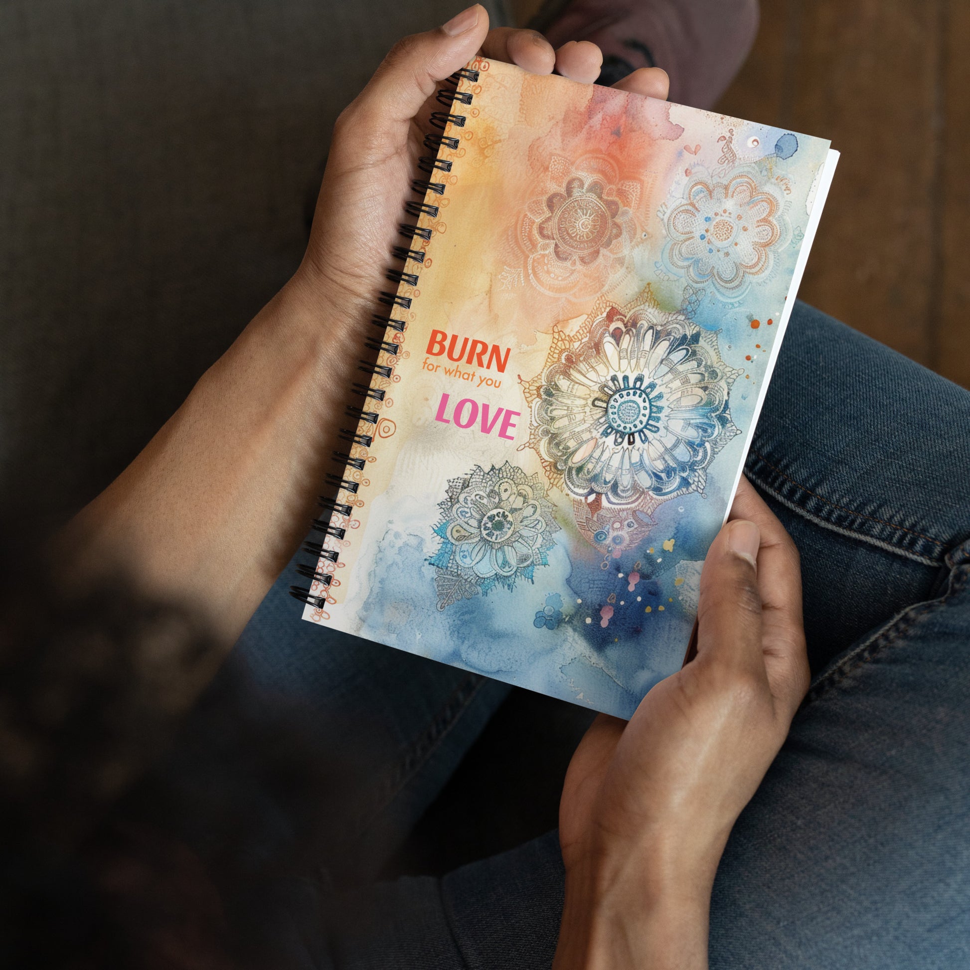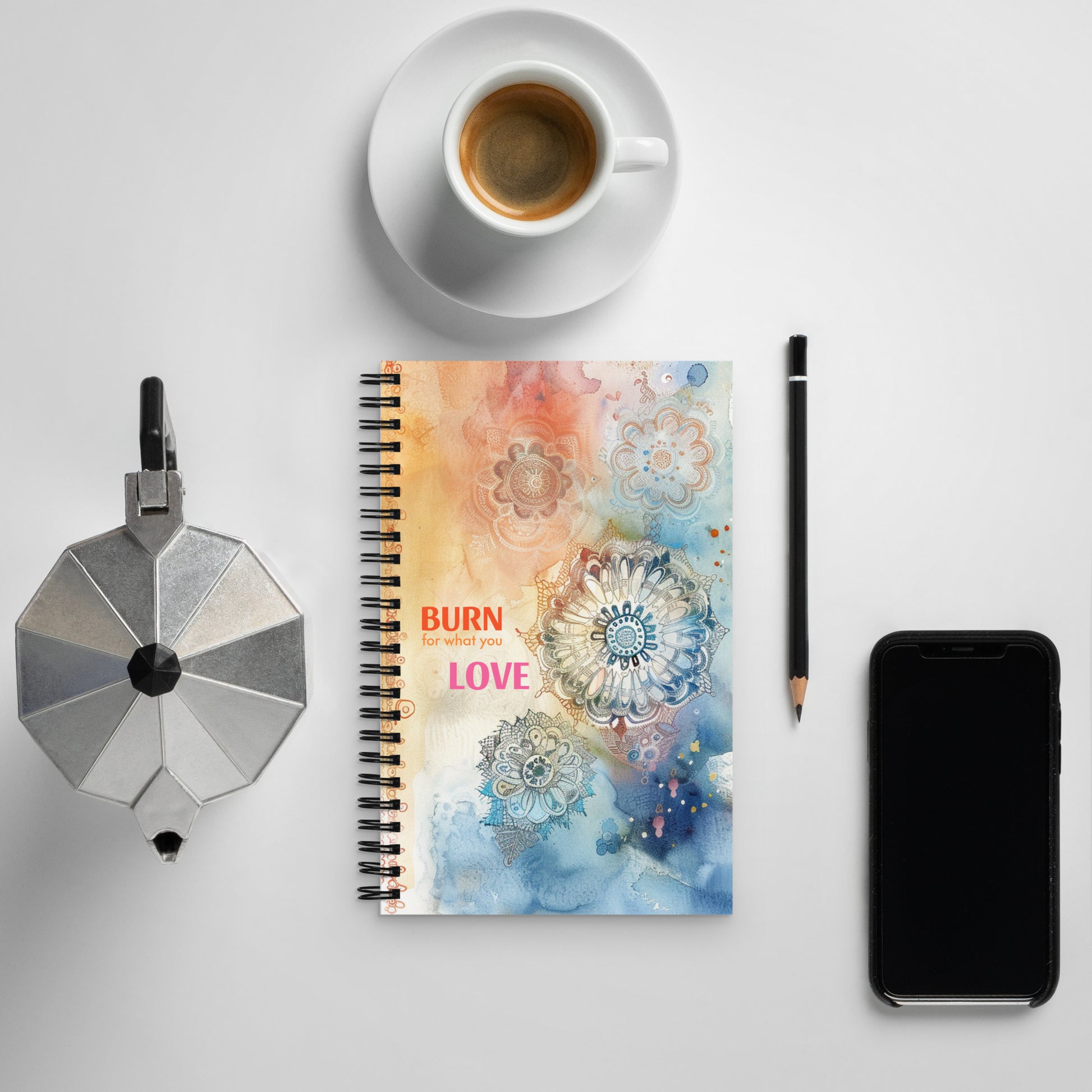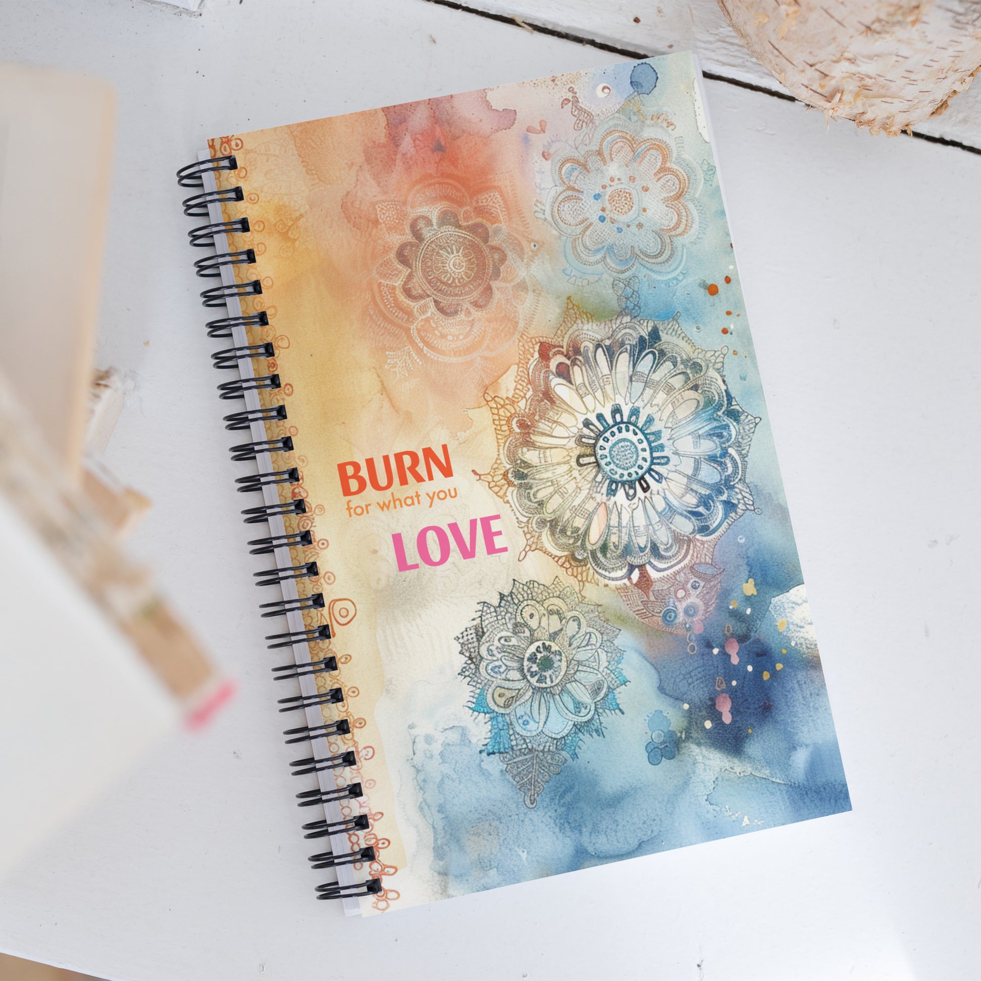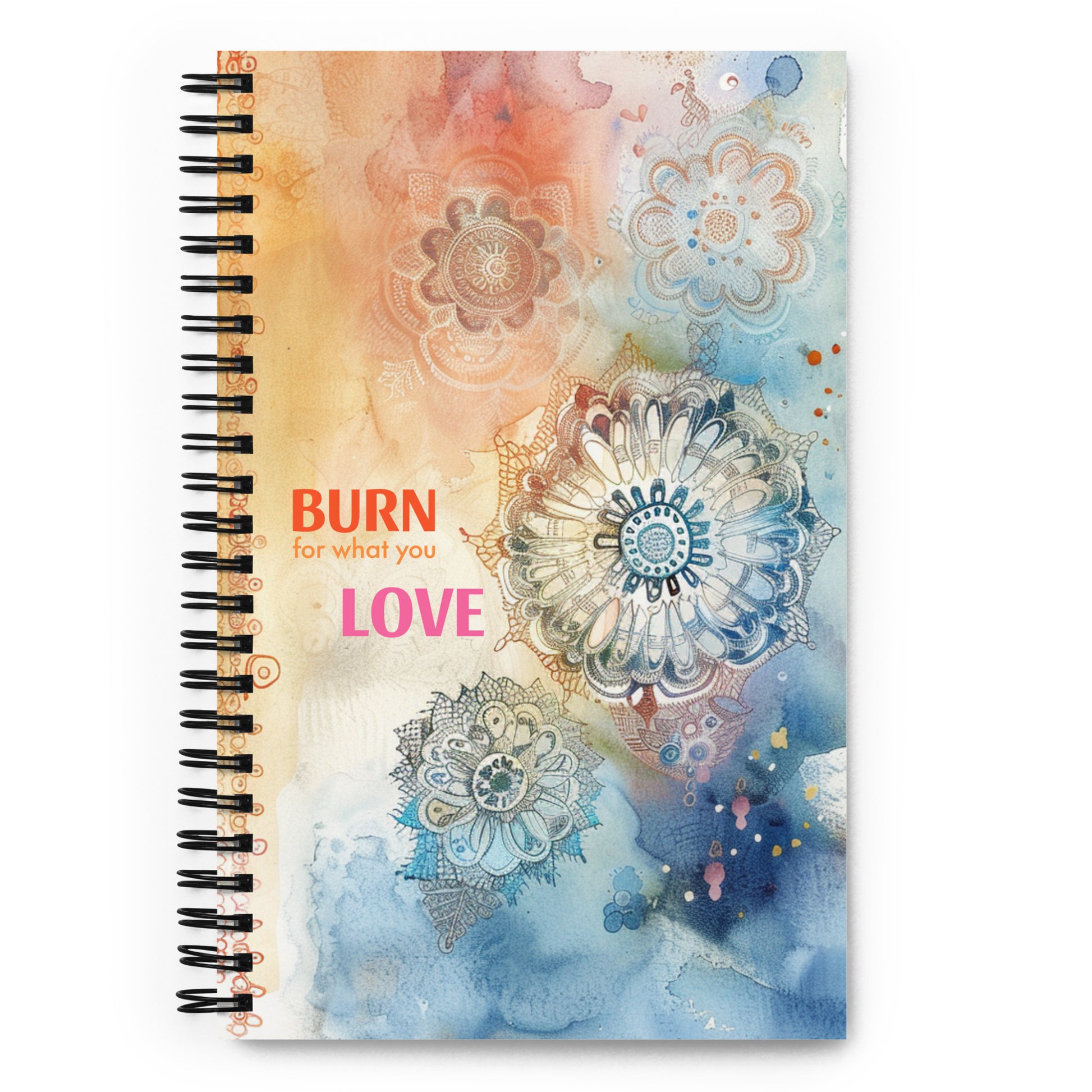Burn for what you love Spiral notebook, blues and oranges, arty design