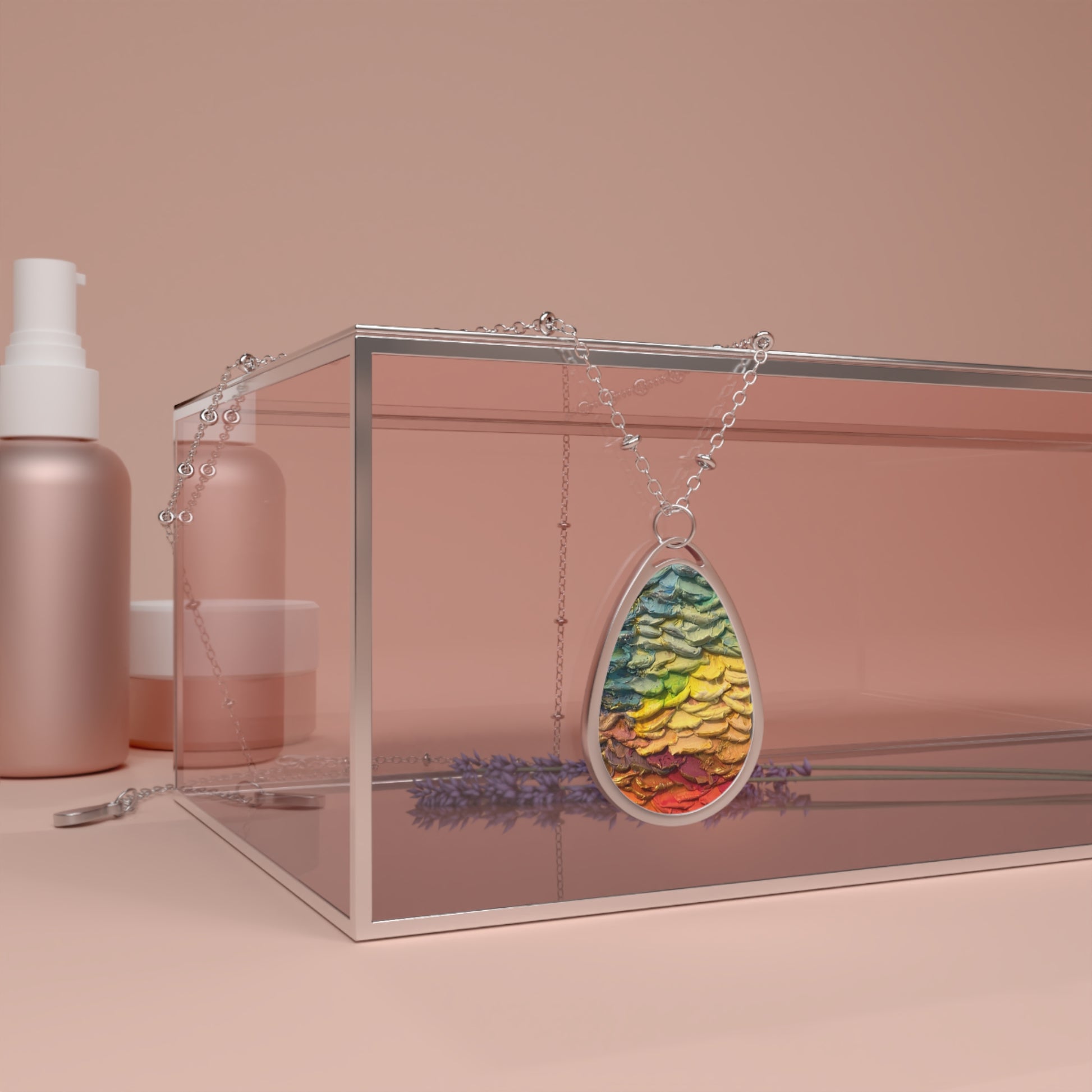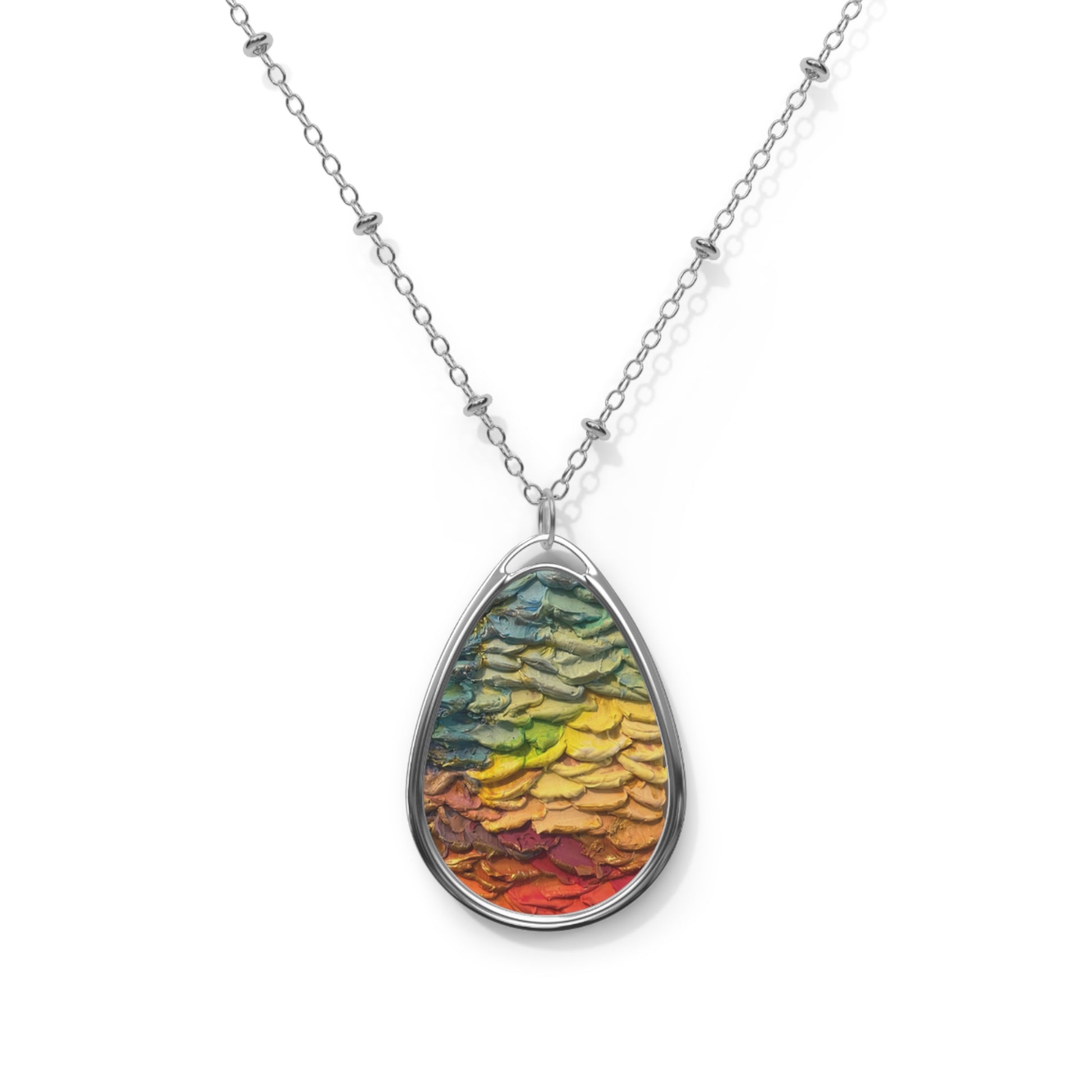 Cascading colours Oval Necklace, yellow, orange, green, blue, gold, silver, for him or her, unisex, Aus, UK, USA
