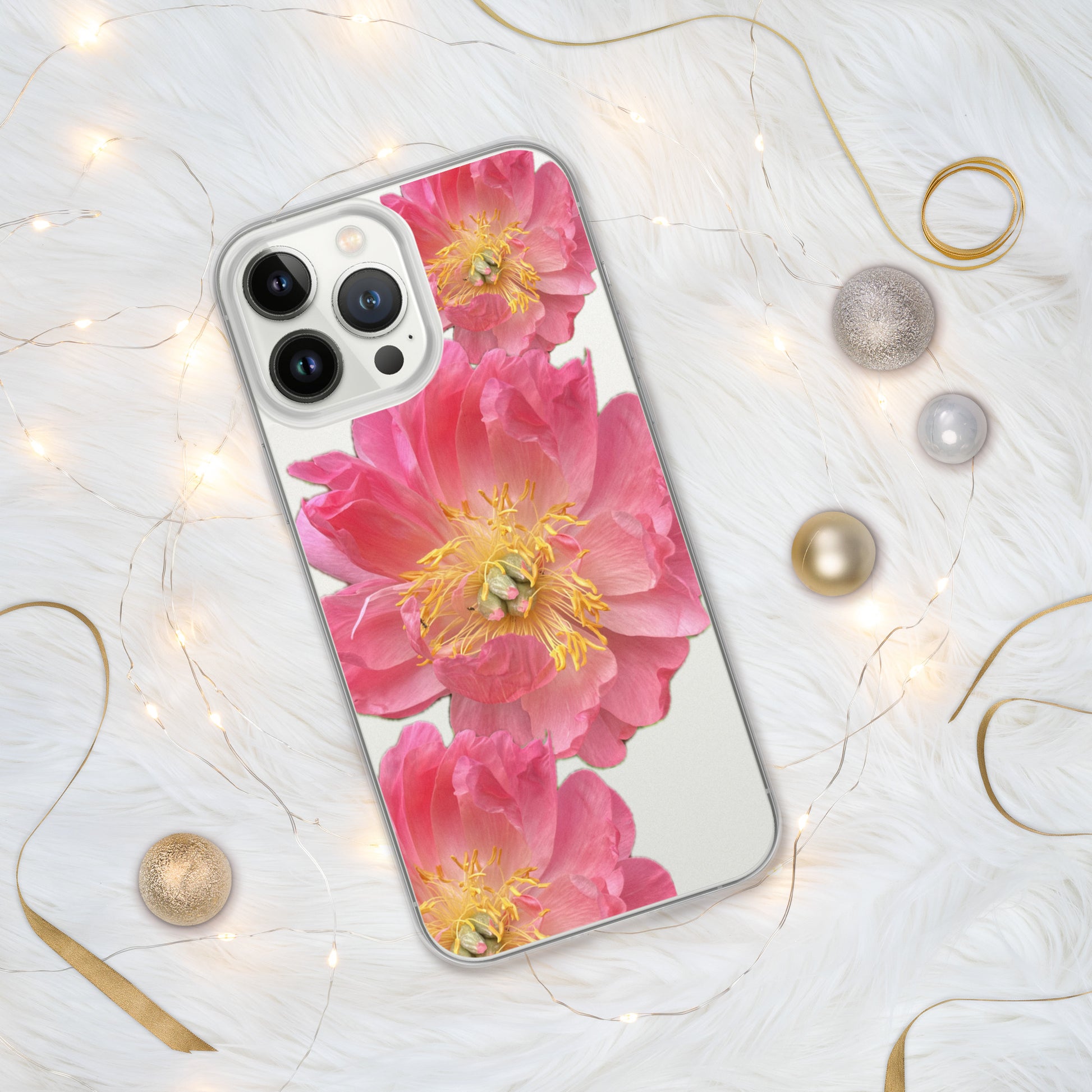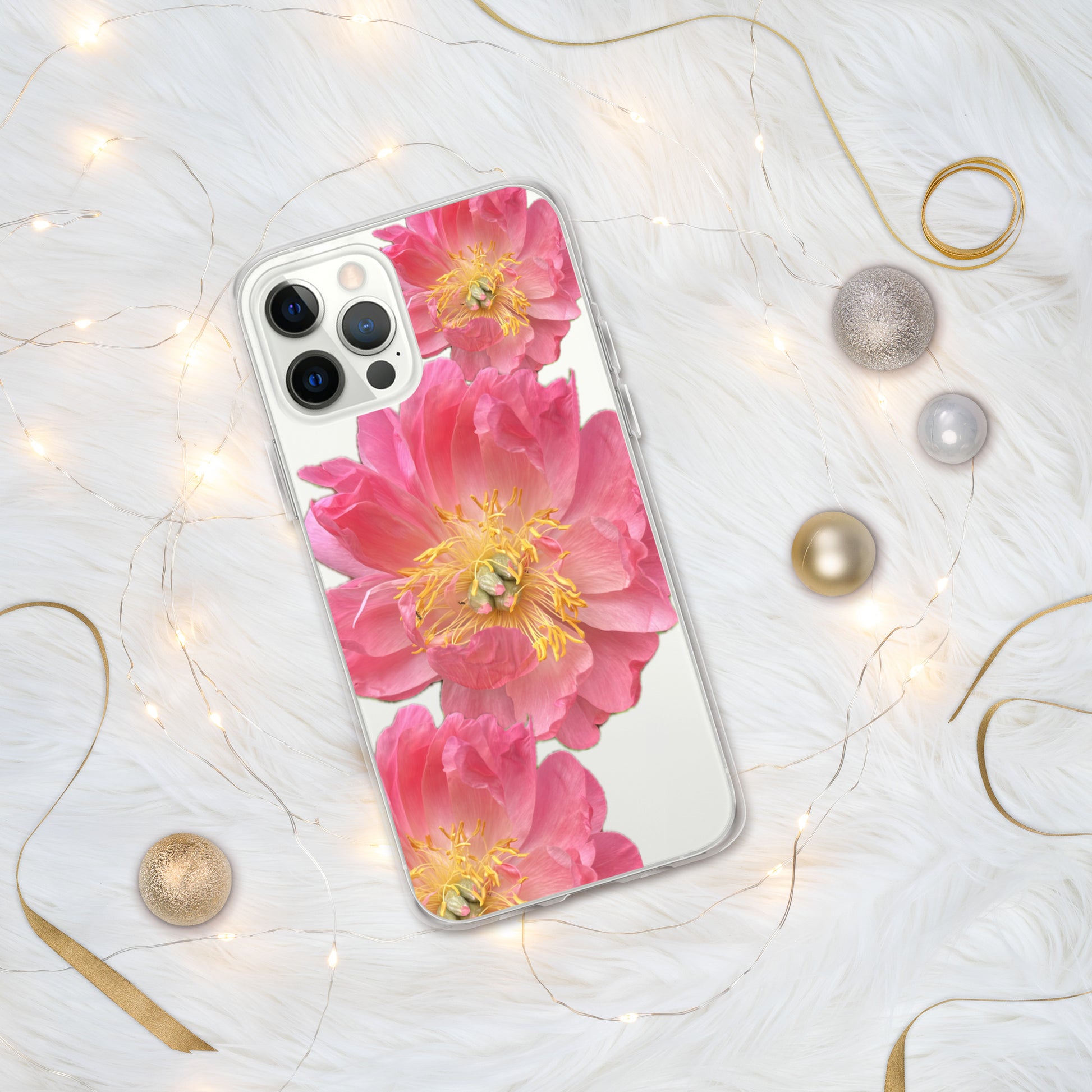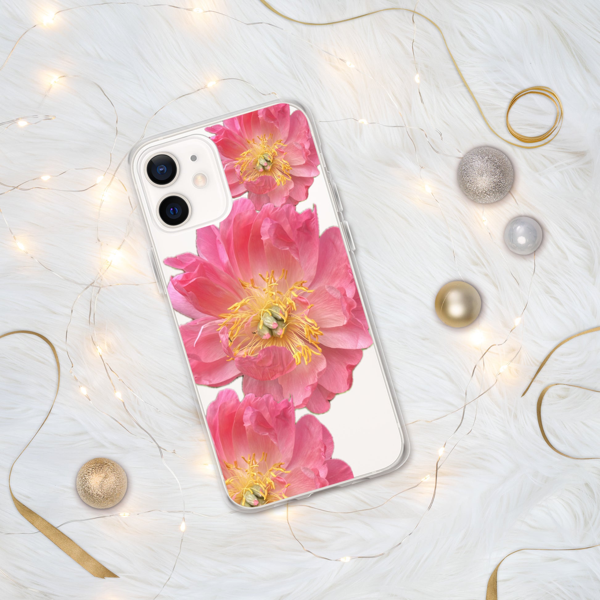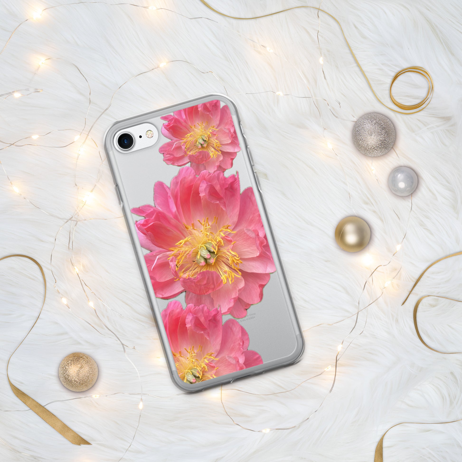 Clear Case for iPhone®, pink floral design of peonies on a clear background, accomodates many models of phone