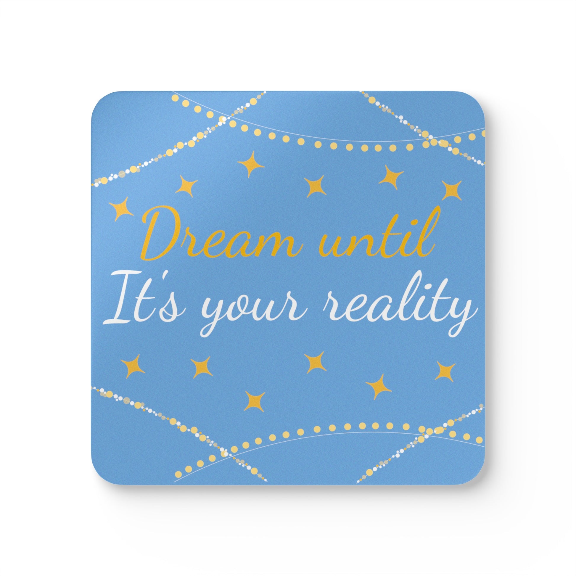 Dream unti its your reality, with each order you get 4x coasters that come in 1x size, are made with a high-gloss top and feature a cork back to prevent sliding.