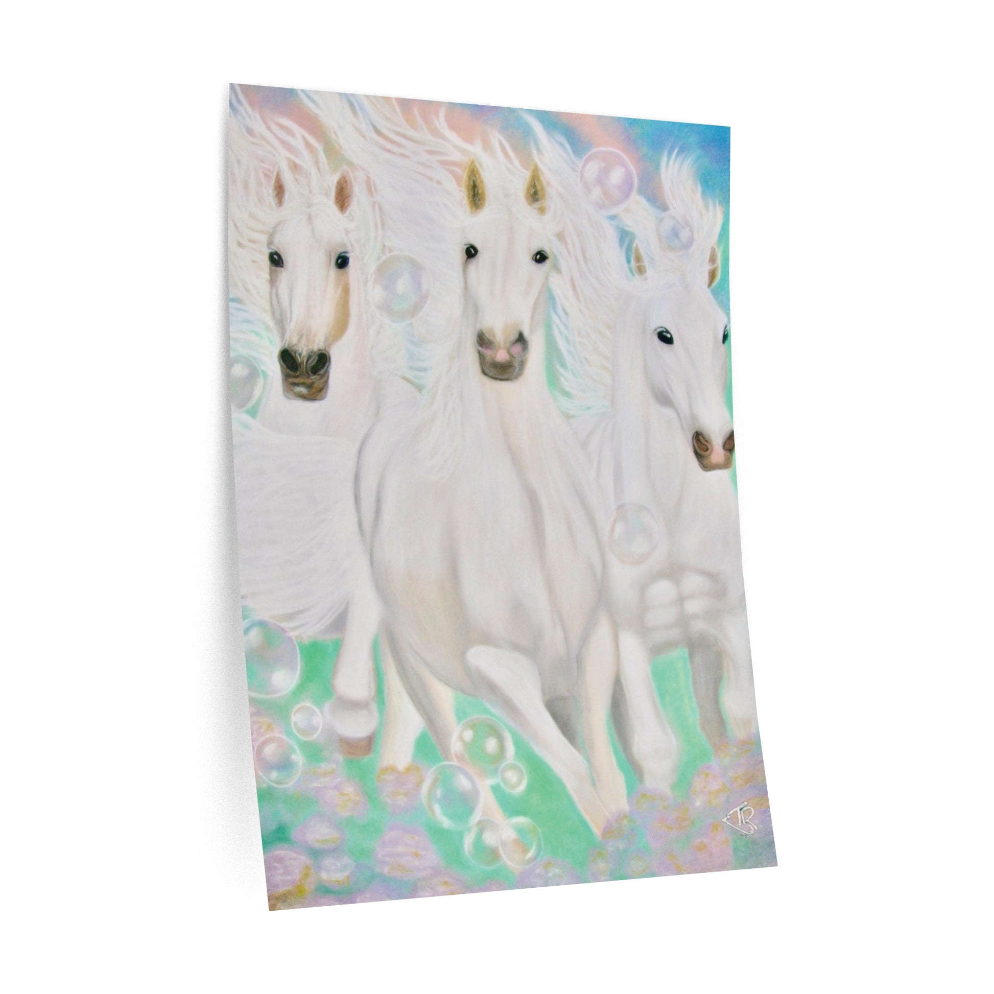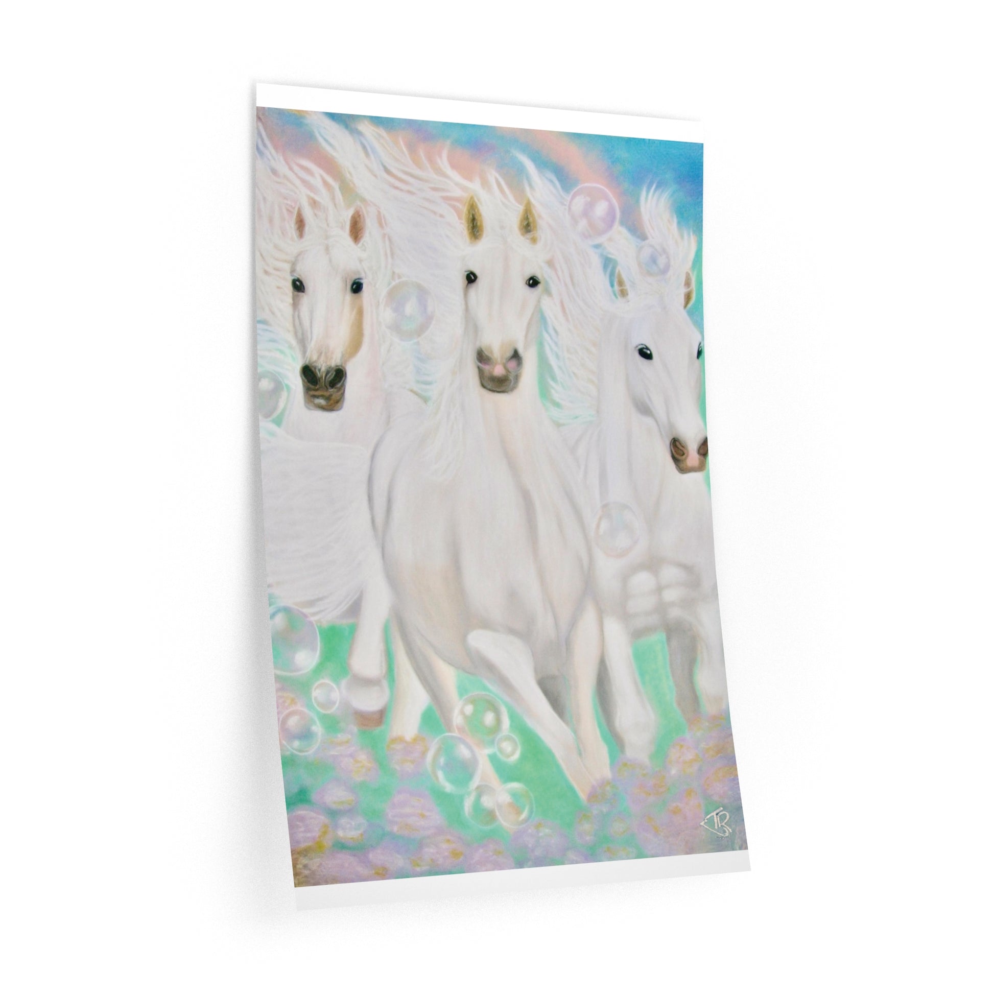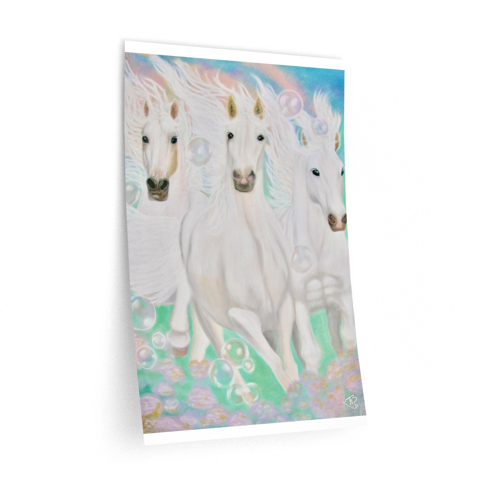 Energised Wall Decal of 3 white horses galloping towards you in fantasy pink and green background, flowing manes, painting created with healing energy, light codes, healing art