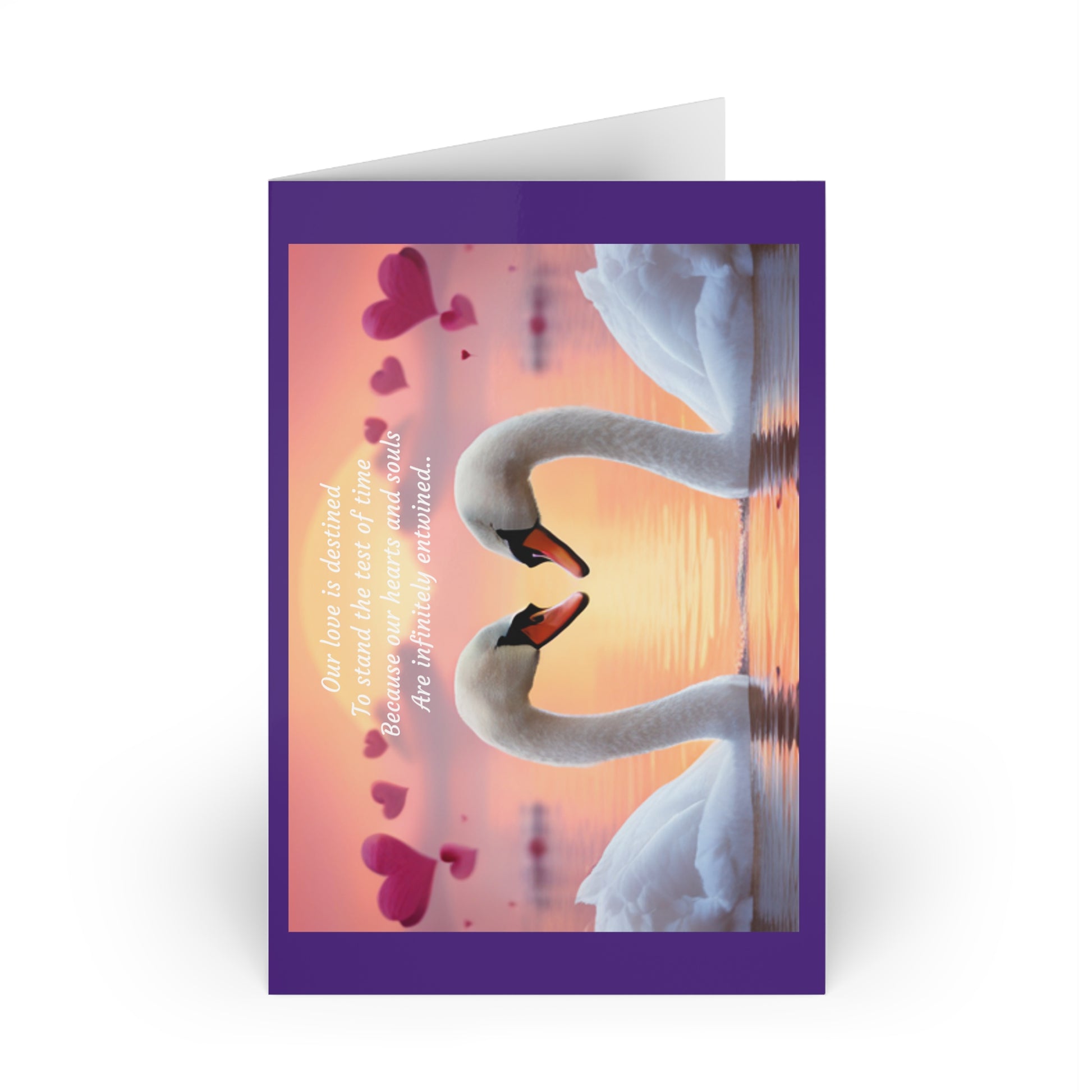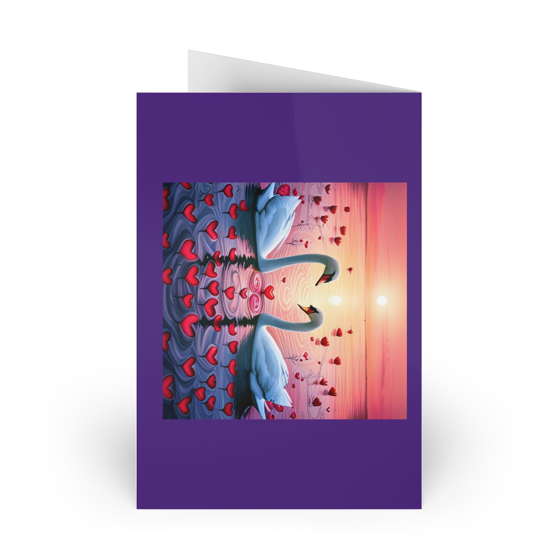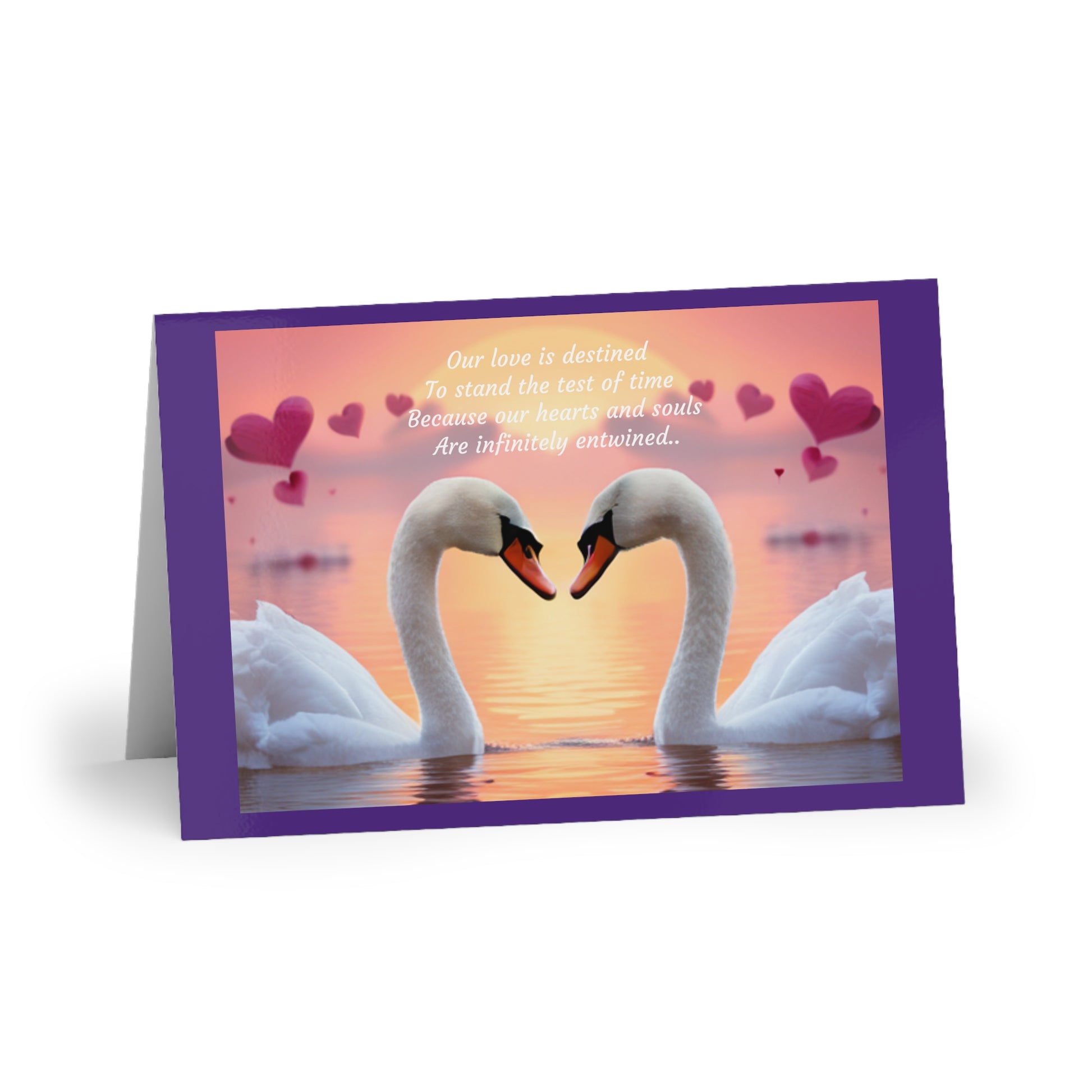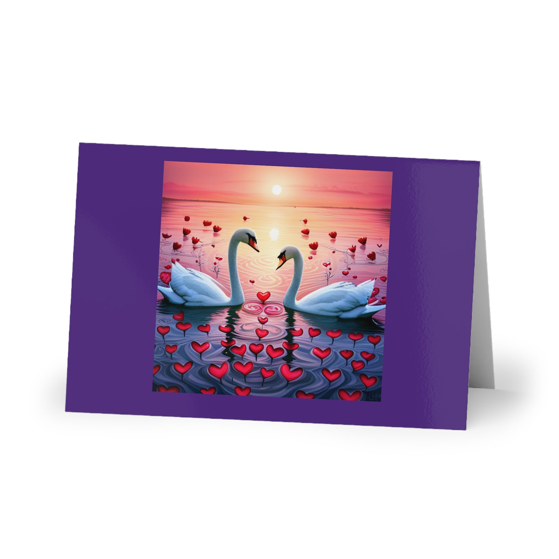 Greeting Cards (1 or 10-pcs), love message, swans on water with hearts in background, blank inside, horizontal orientation