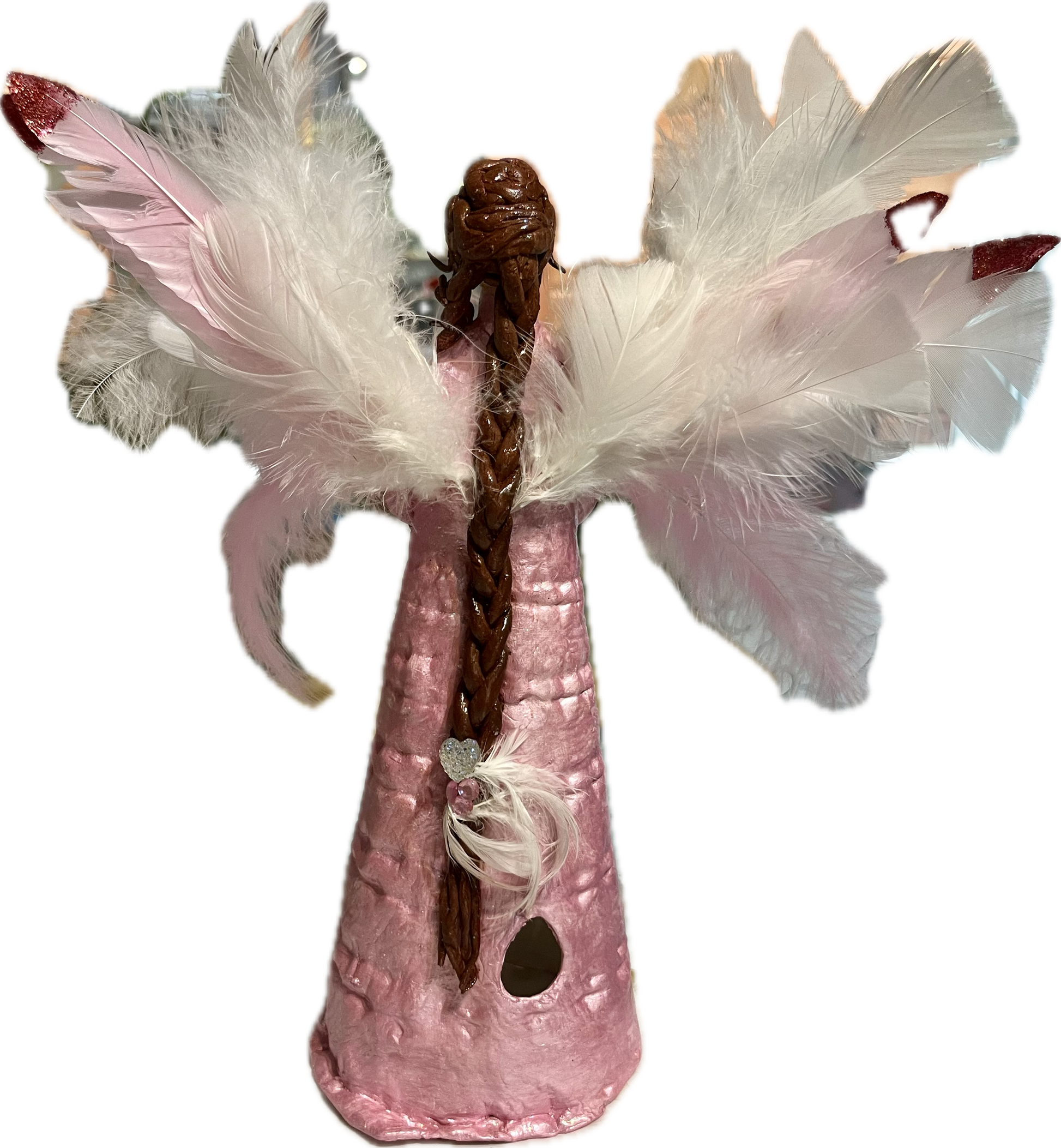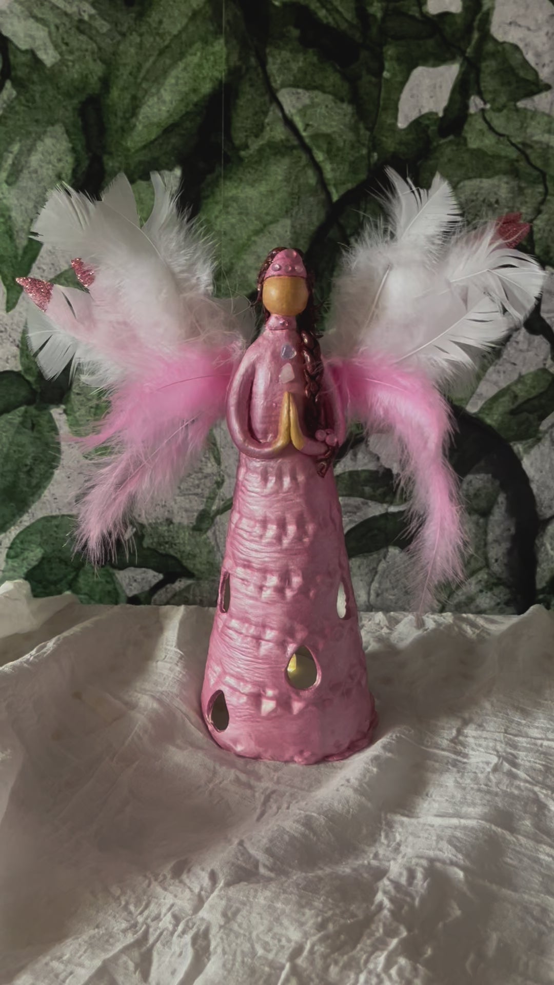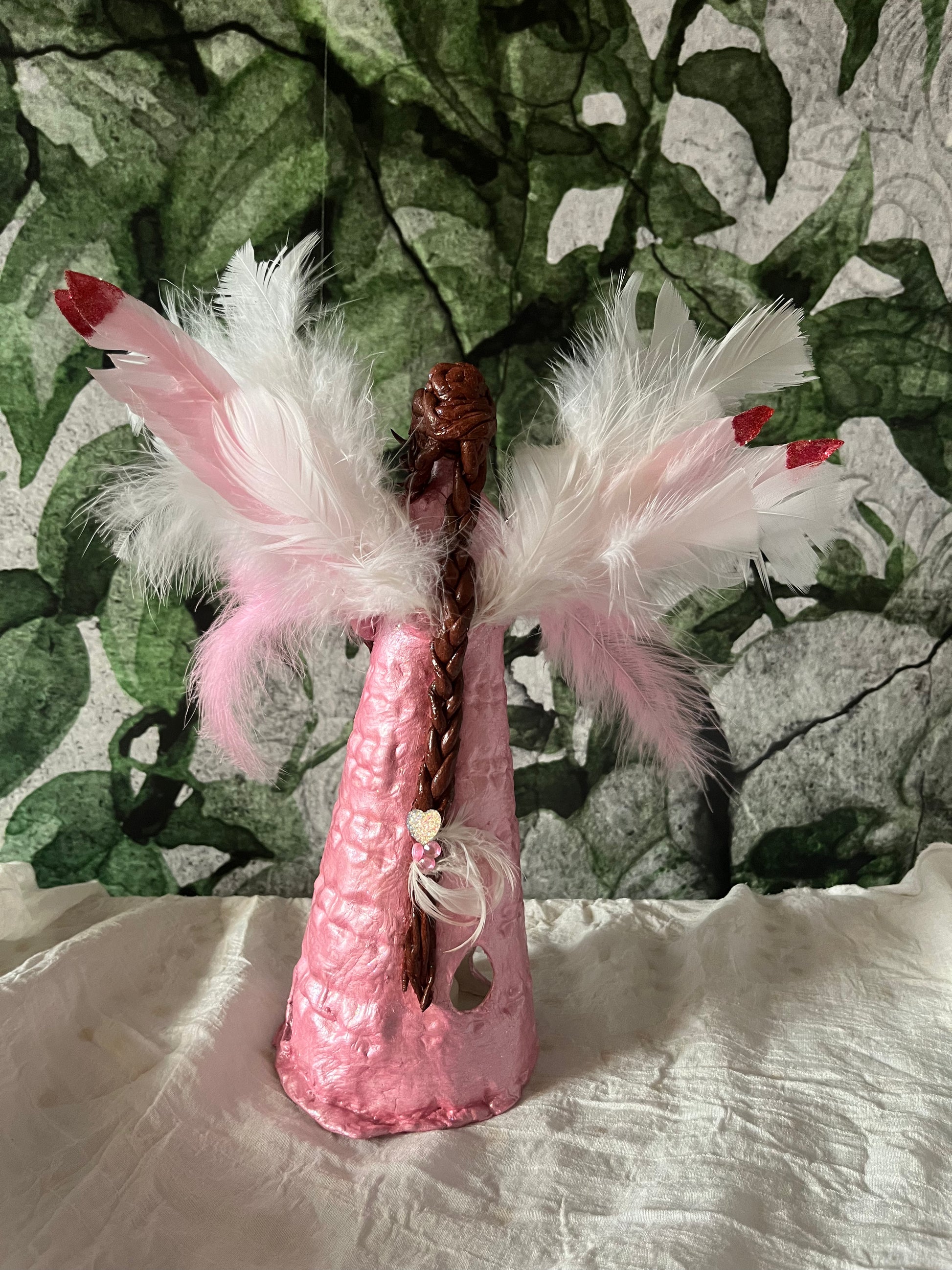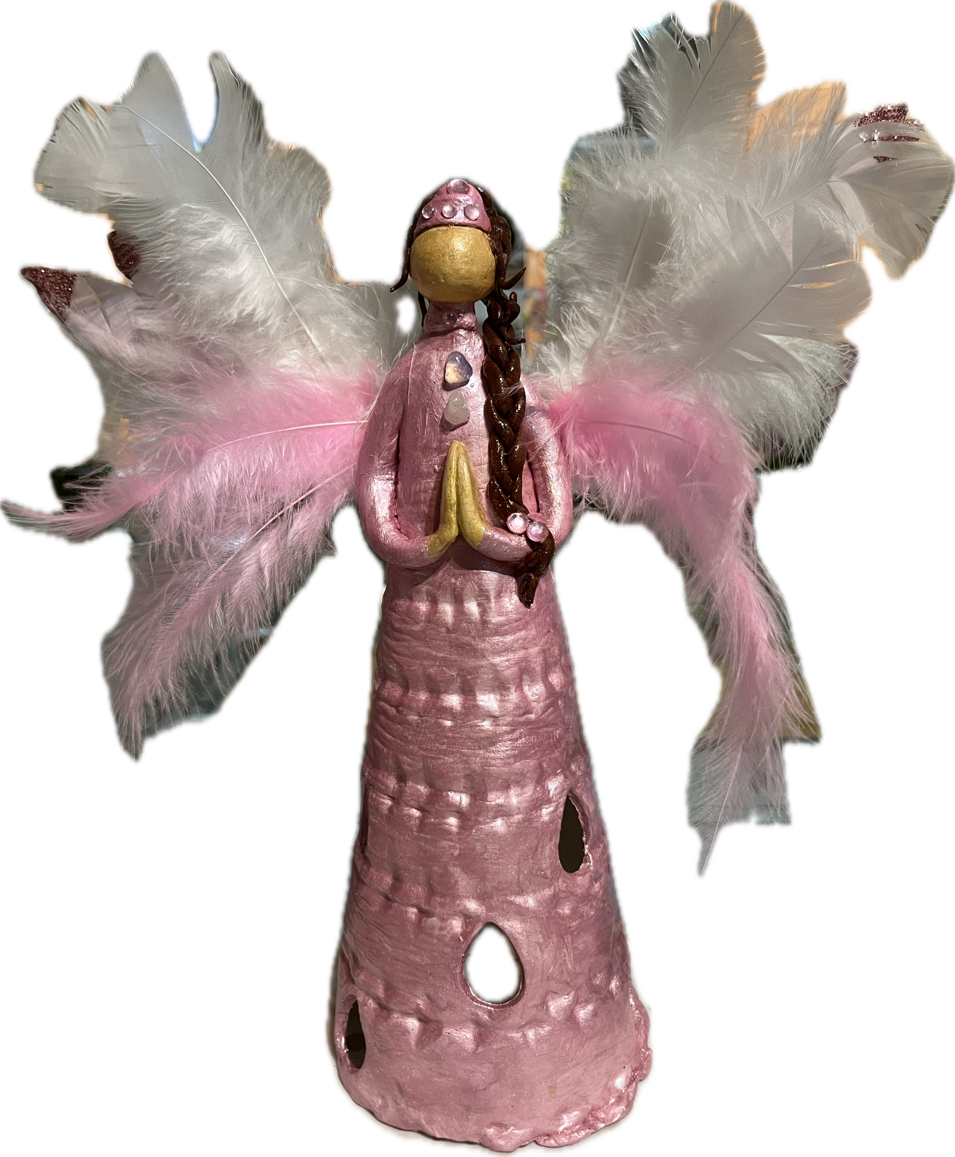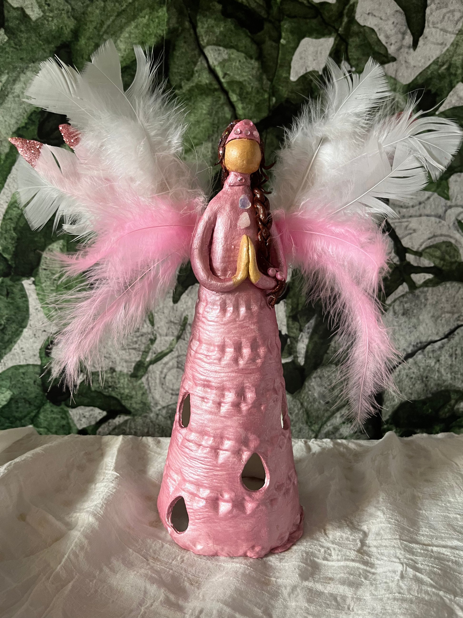 This series of figurines is made of airdry clay. Each figurine is unique, one of a kind and has a different character. They are made by a multidimensional healer and have healing energies in them. A flameless candle sits inside the dress and when switched on creates a luminous effect ( included). this one also has a rose quartz crystal at her high heart chakra.