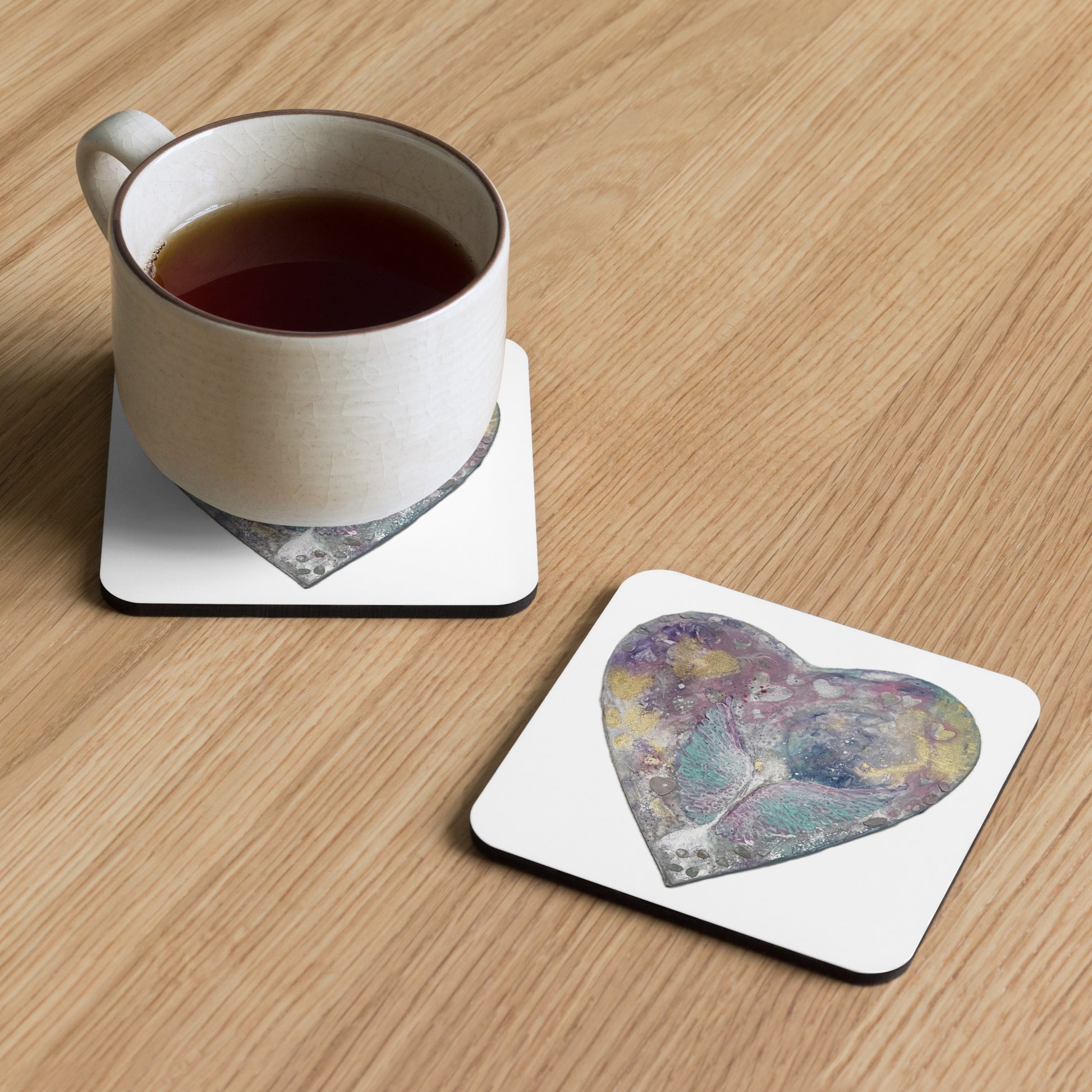 Light activated ascension cork-back coaster, semi abstract design from acrylic painting, energies of cosmic love, angels and divine beings flooding the earth with love form 7th and 8th dimensions