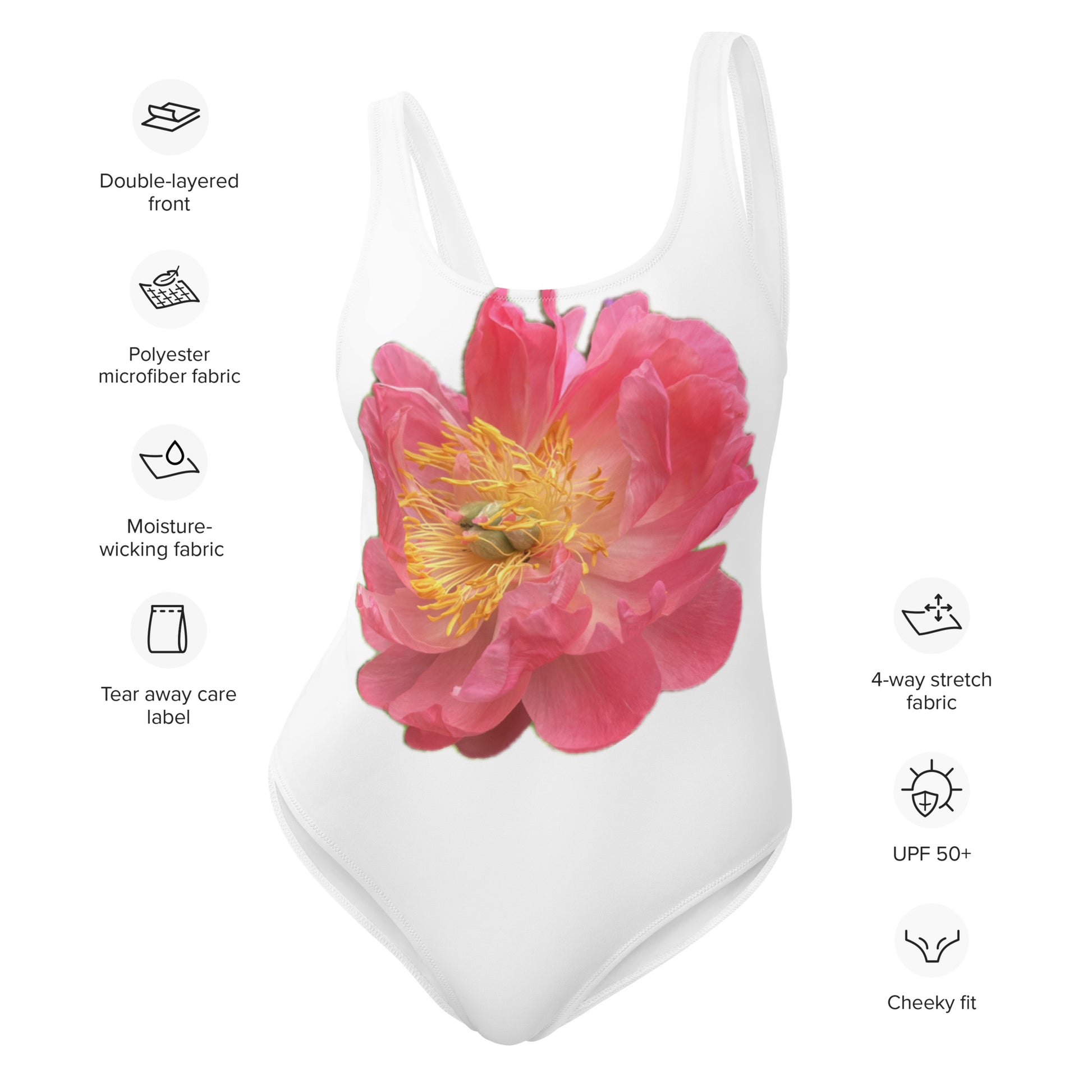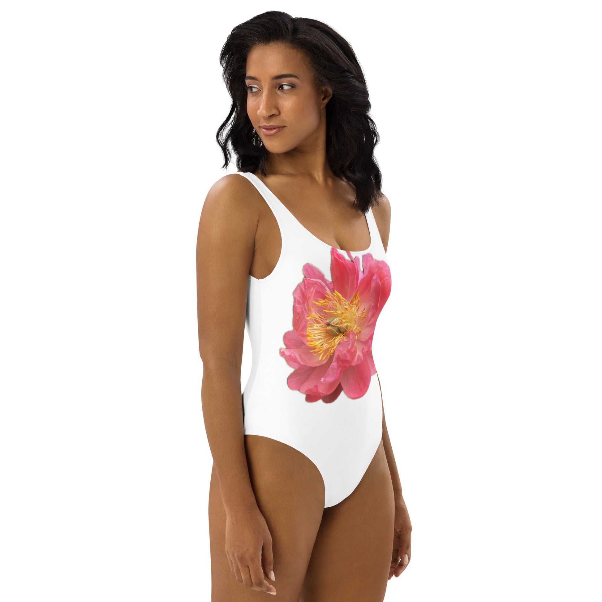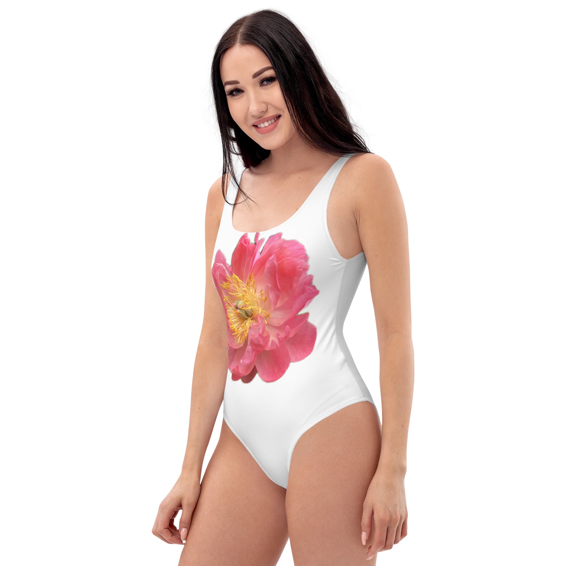 One-Piece Swimsuit, white with pink peony design, bright, elegant, feminine, flattering, chlorine resistent,