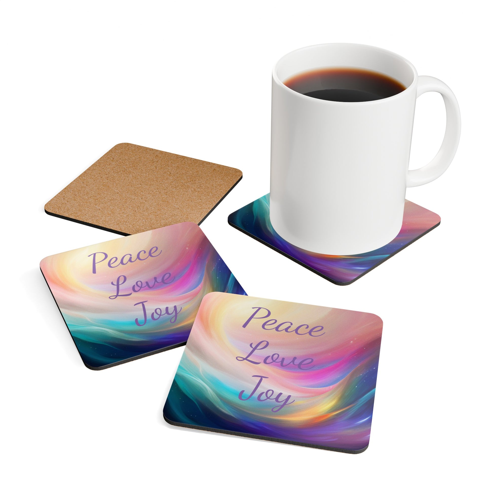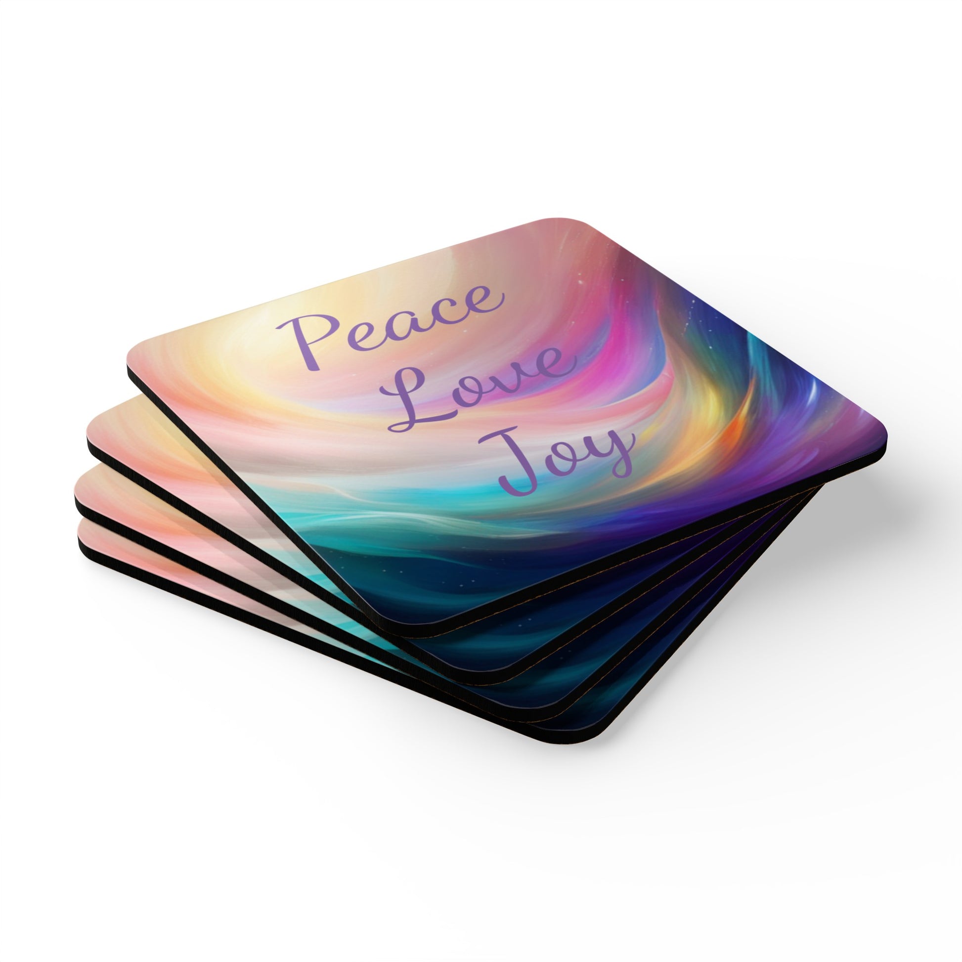 Peace, Love, Joy, Corkwood Coasters, Set of 4, Aus, UK, USA, remind yourself of your intentions as you sip your drinks, gift for everyone