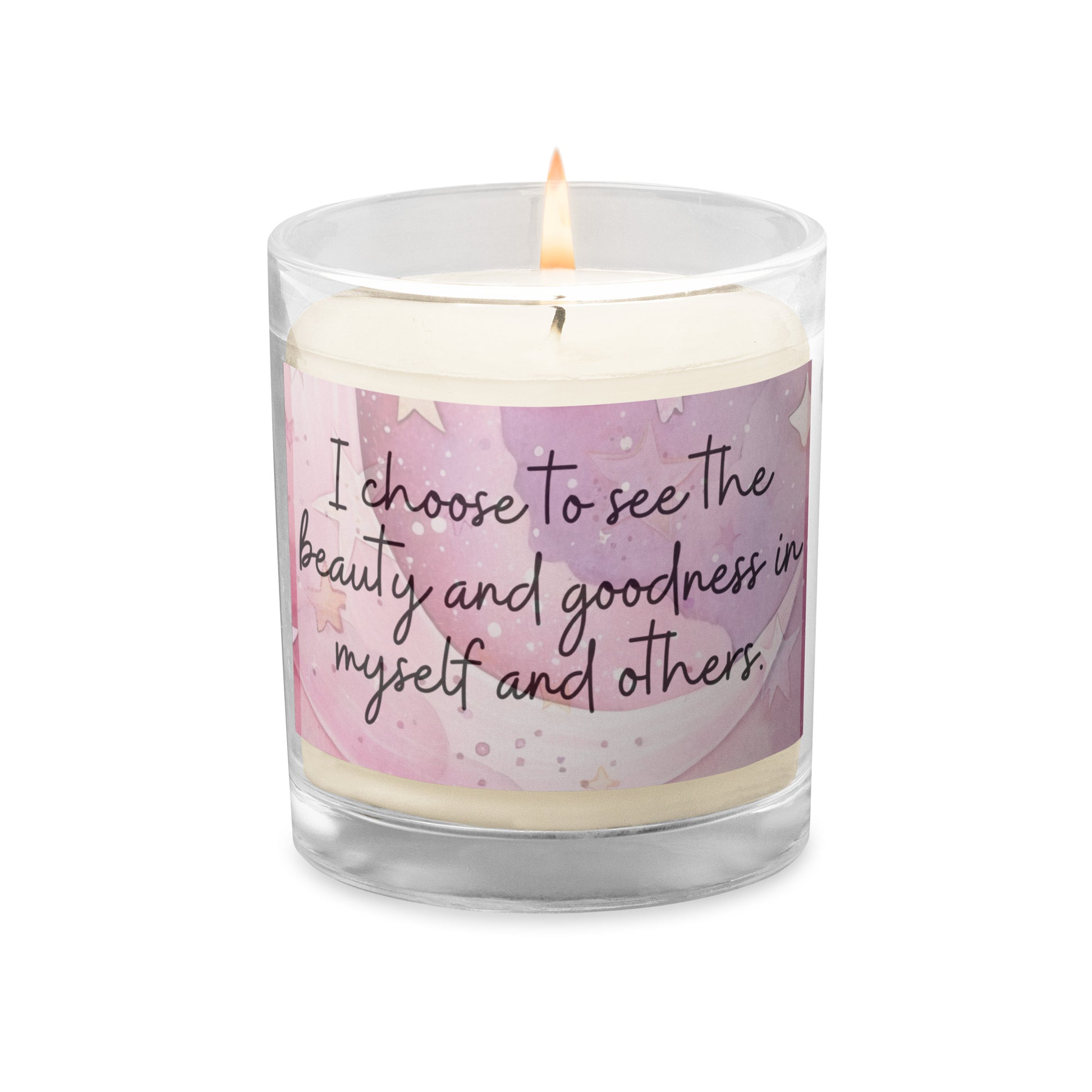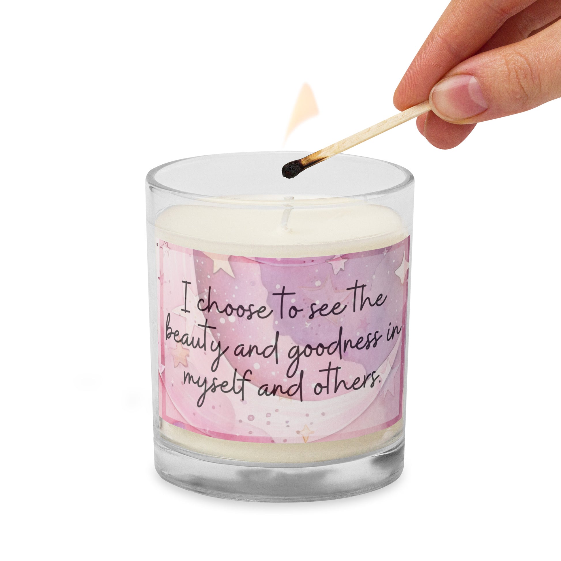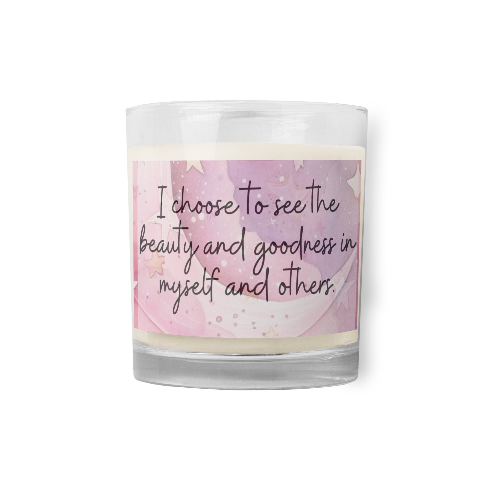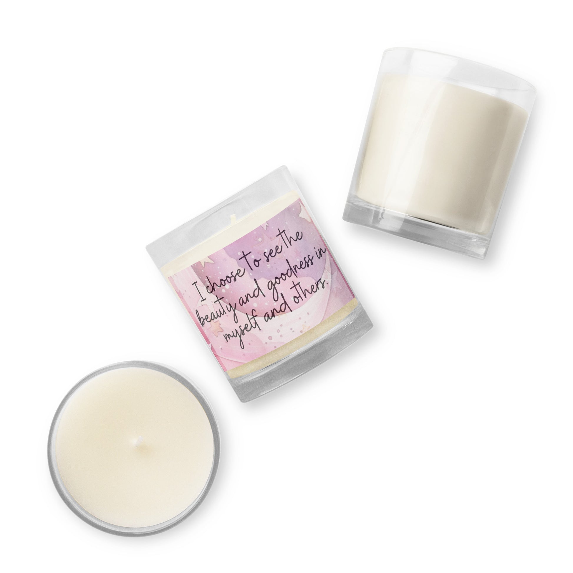 Positivity Affirmation Glass jar soy wax candle, I choose to see goodness and beauty in my self and others, pink night sky, stars, moon