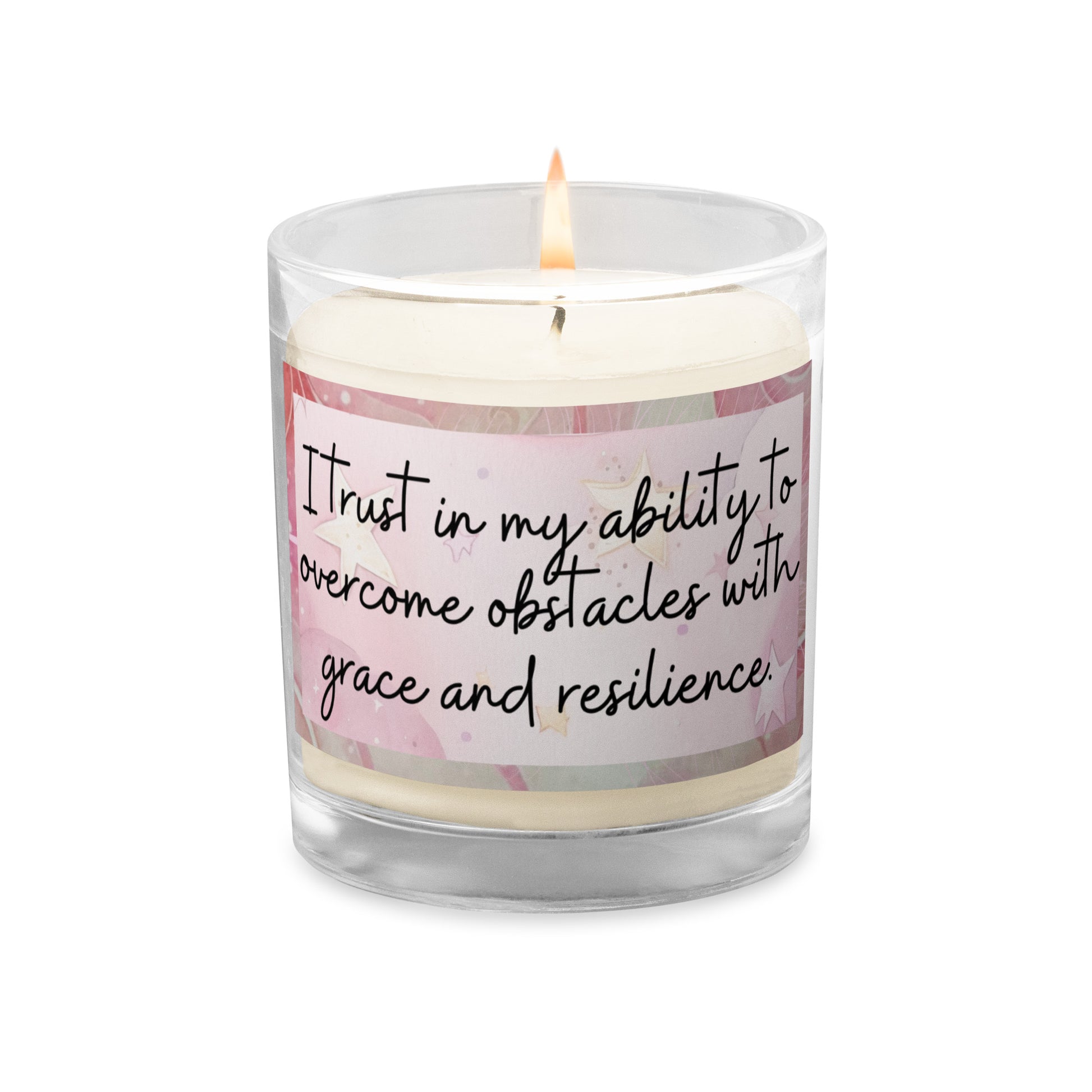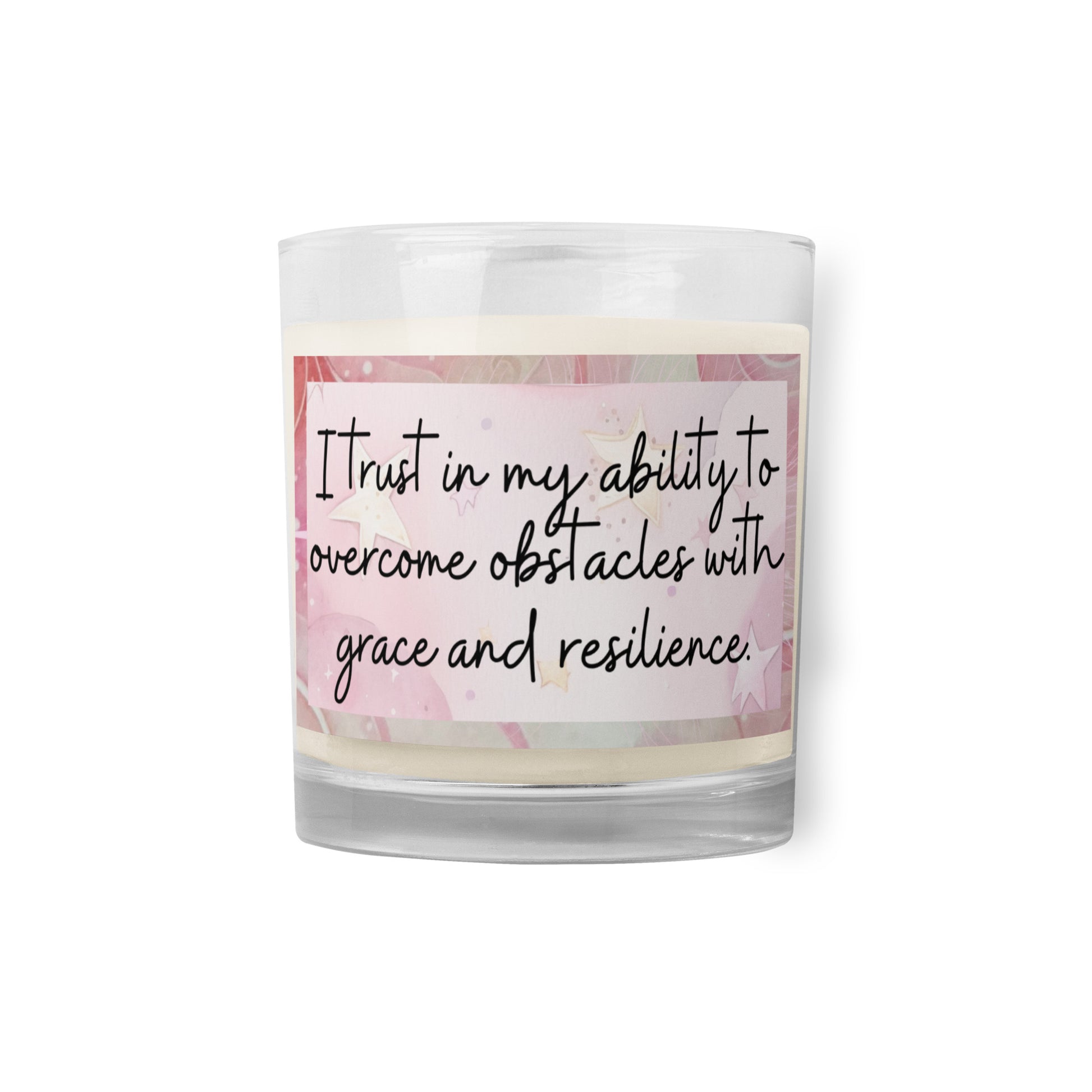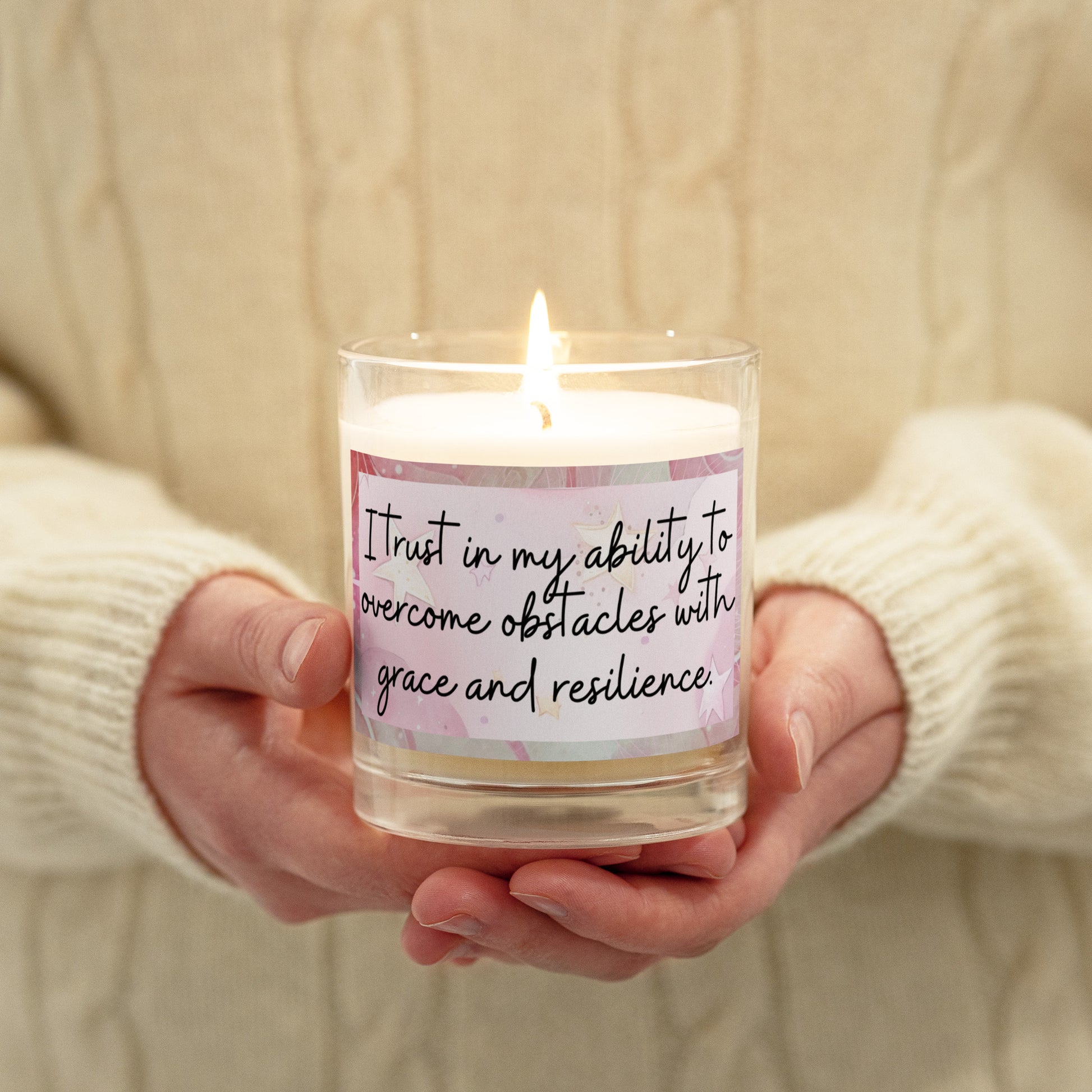 Positivity Affirmation Glass jar soy wax candle, I trust in my ability to overcome obstacles with grace and resilience, pink, moon, stars, night, sky