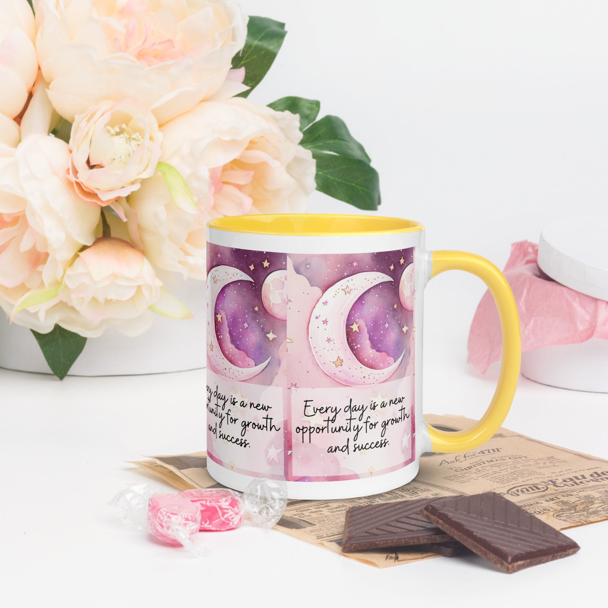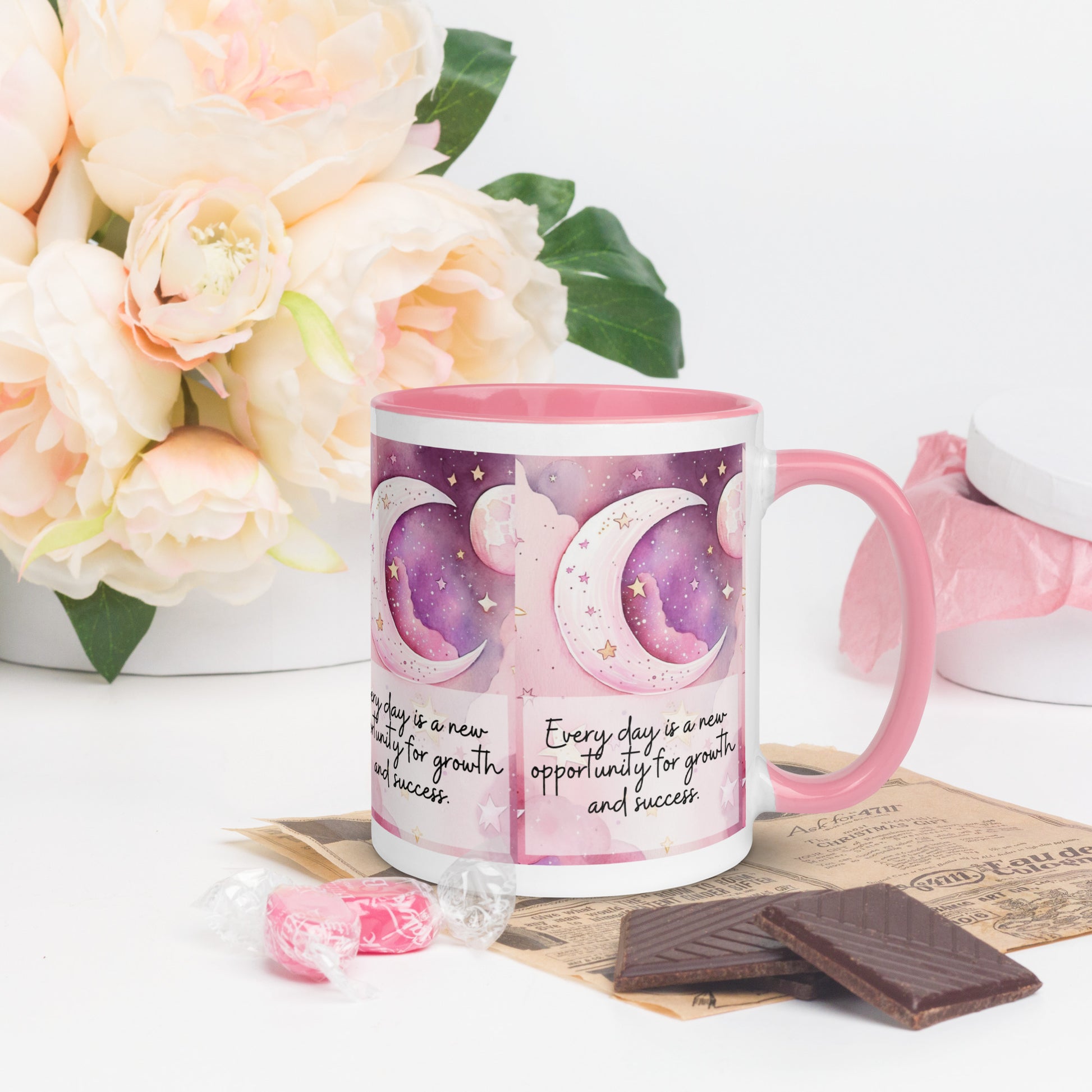 Positivity Affirmation Mug with Color Inside, Everyday is a new opportunity for growth and success, pink moon, stars, night sky