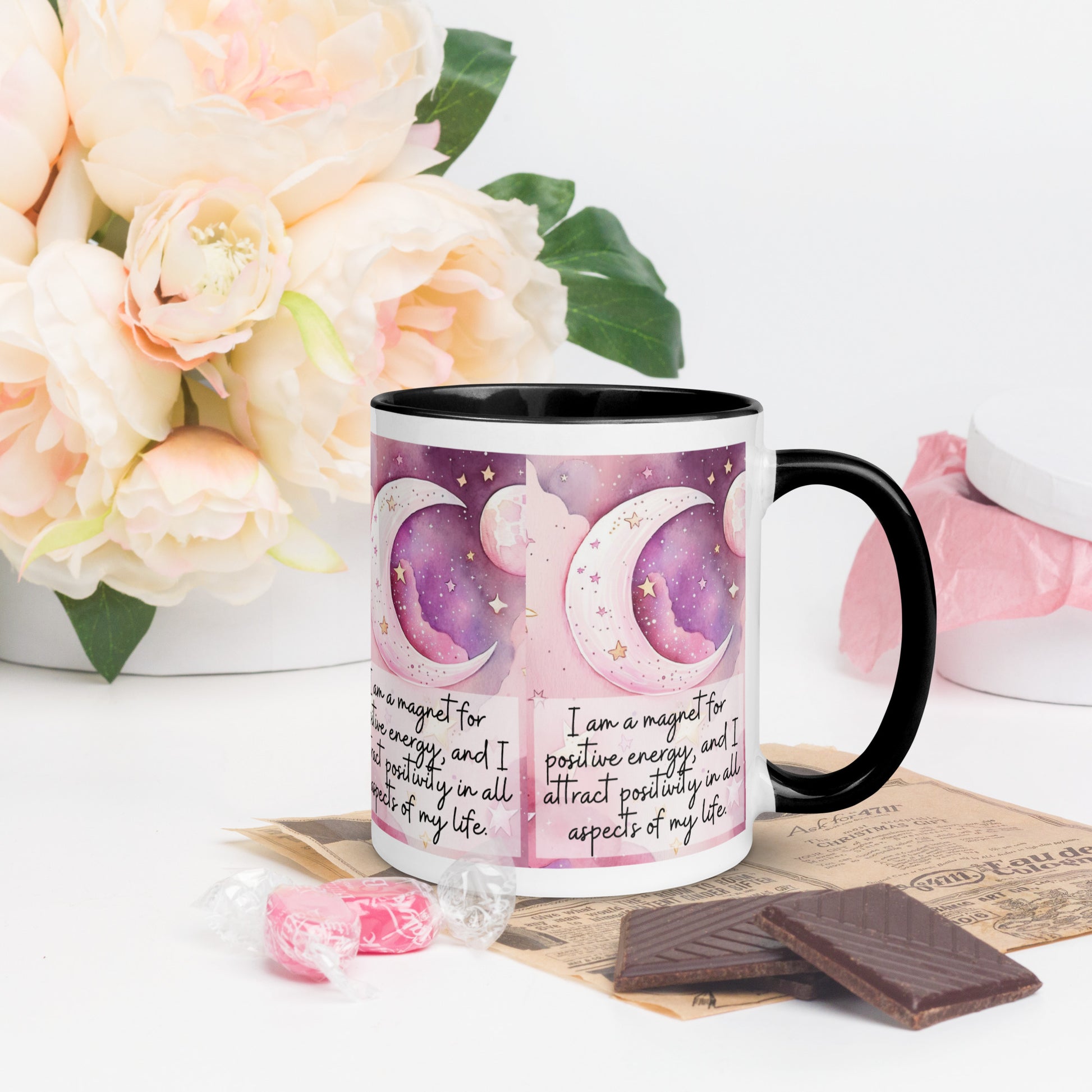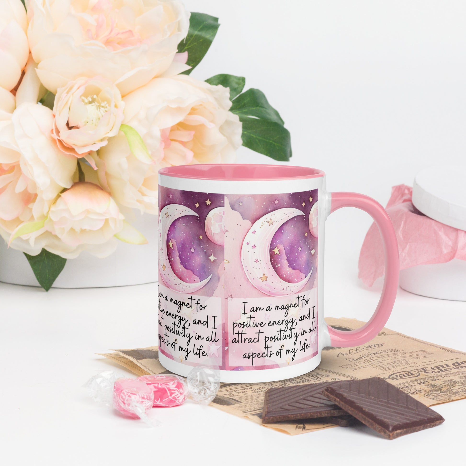 Positivity Affirmation Mug with Color Inside, I am a magnet for positive energy, and I attract positivity in all aspects of my life, pink moon, stars, night sky