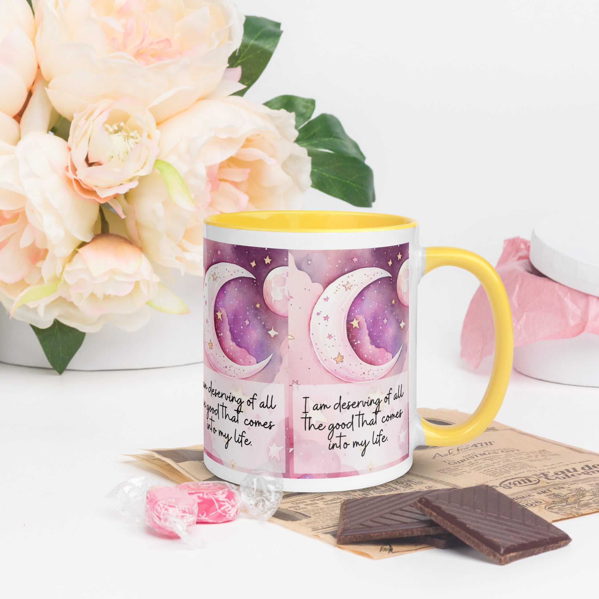 Positivity Affirmation Mug with Color Inside, I am deserving of all the good that comes into my life, pink moon, stars, night sky
