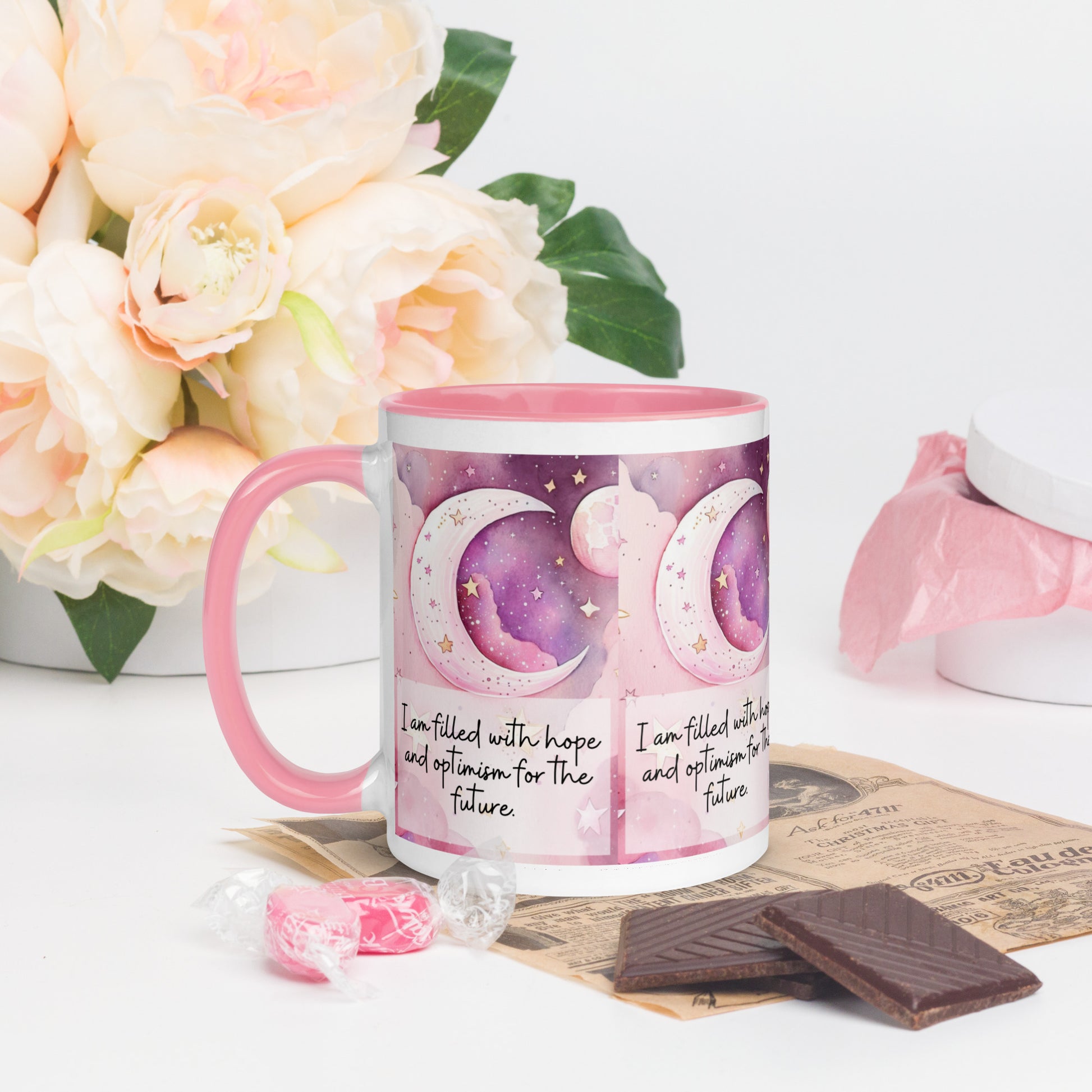 Positivity Affirmation Mug with Color Inside, I am filled with hope and optimism for the future, stars, night sky