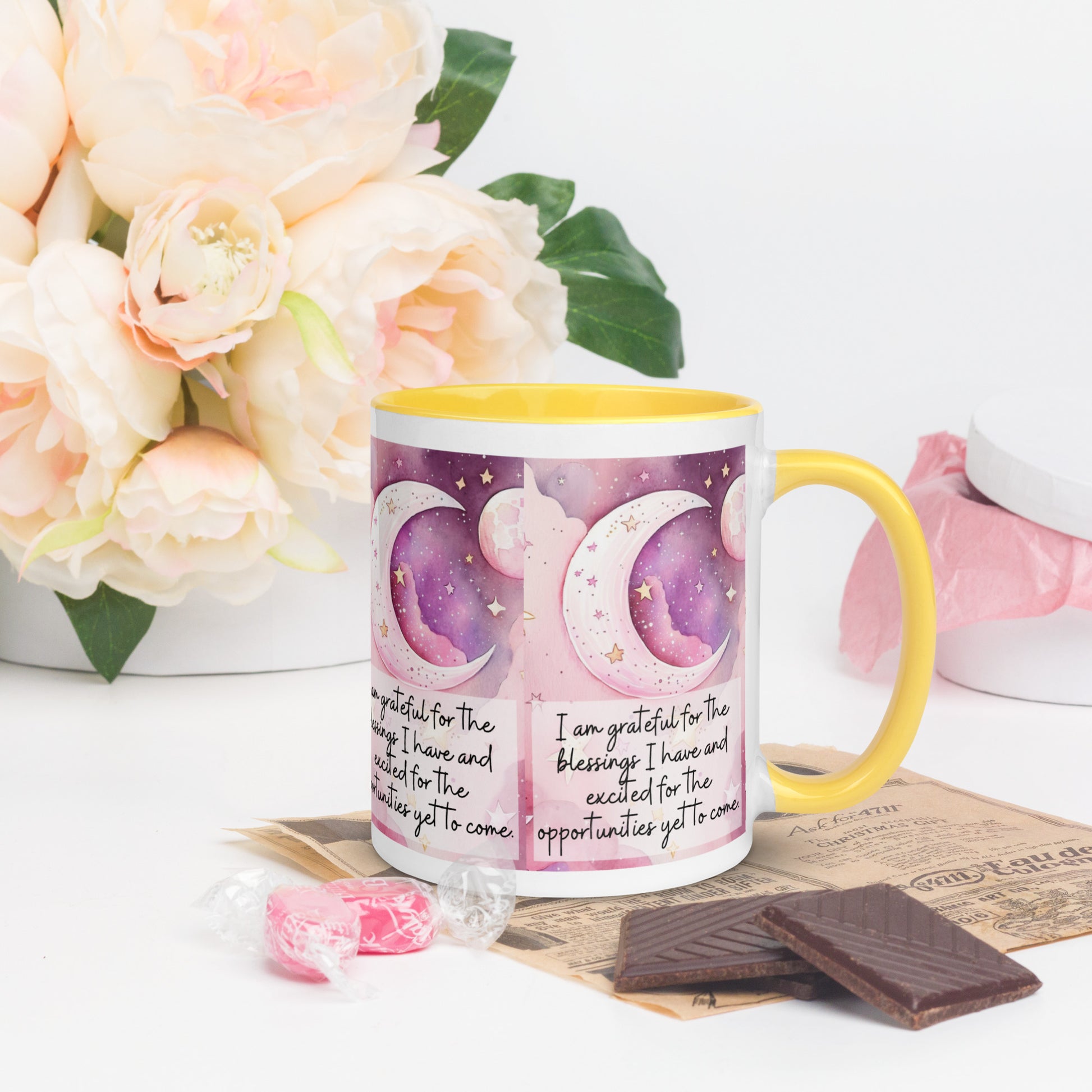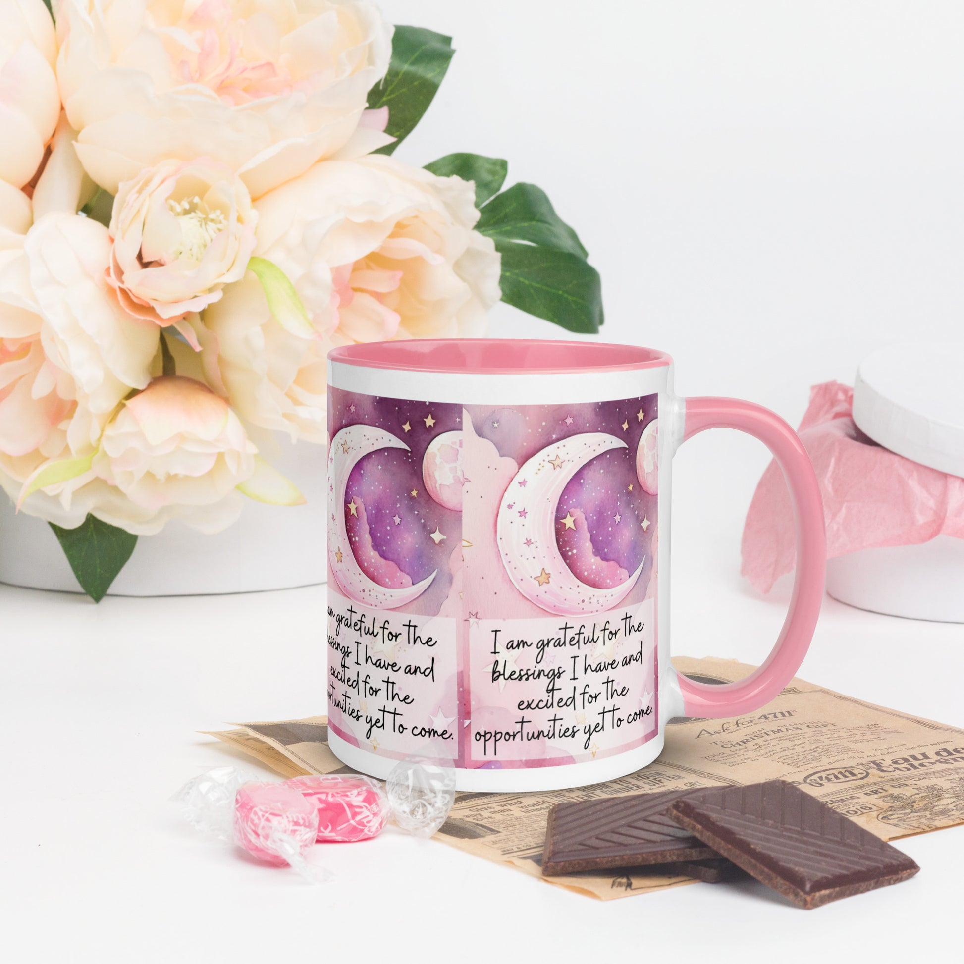 Positivity Affirmation Mug with Color Inside, I am grateful for the blessings I have and excited for the opportunities yet to come, pink moon, stars, night sky
