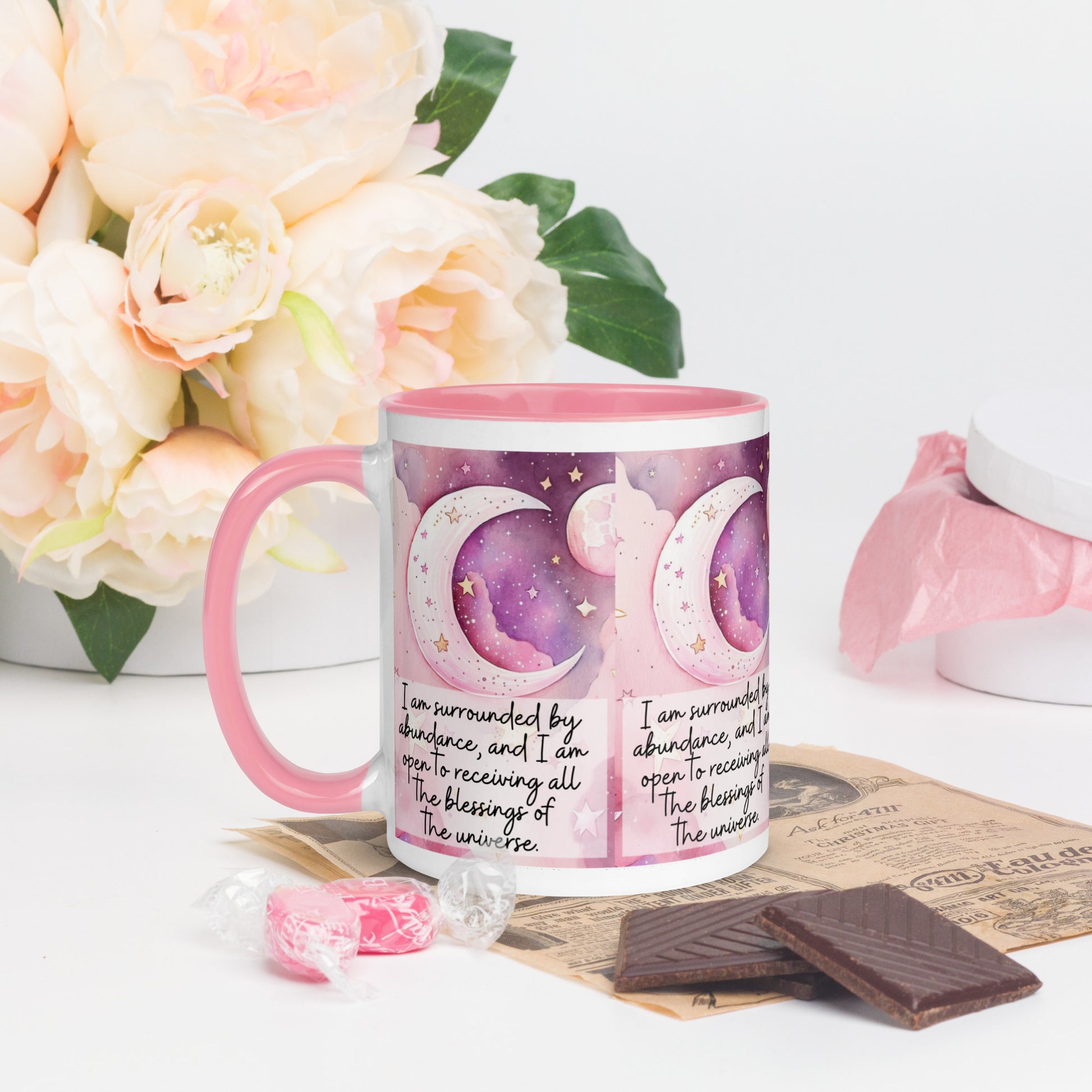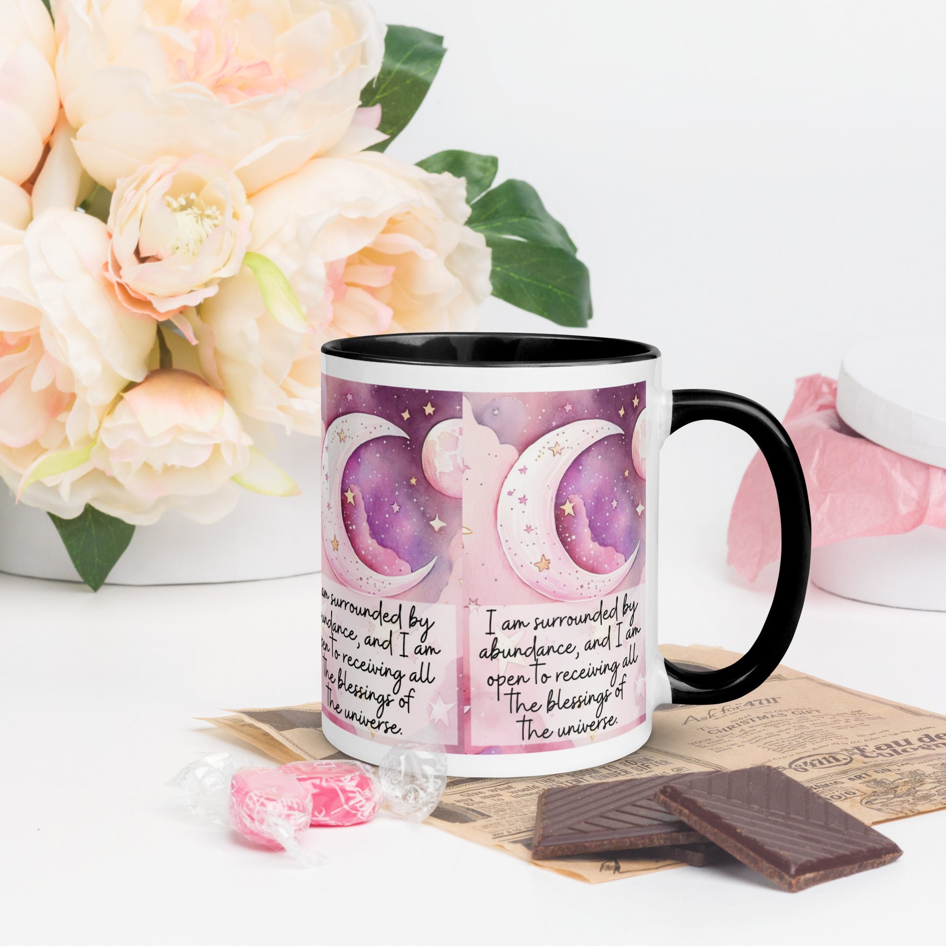 Positivity Affirmation Mug with Color Inside, I am surrounded by abundance, and I am open to receiving all the blessings of the universe, stars, night sky