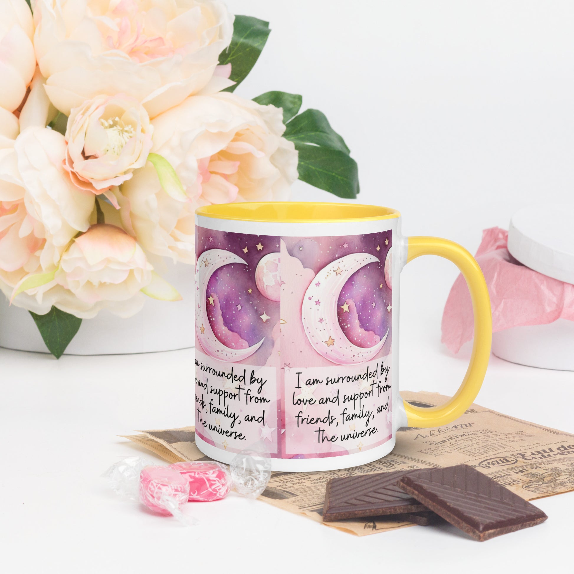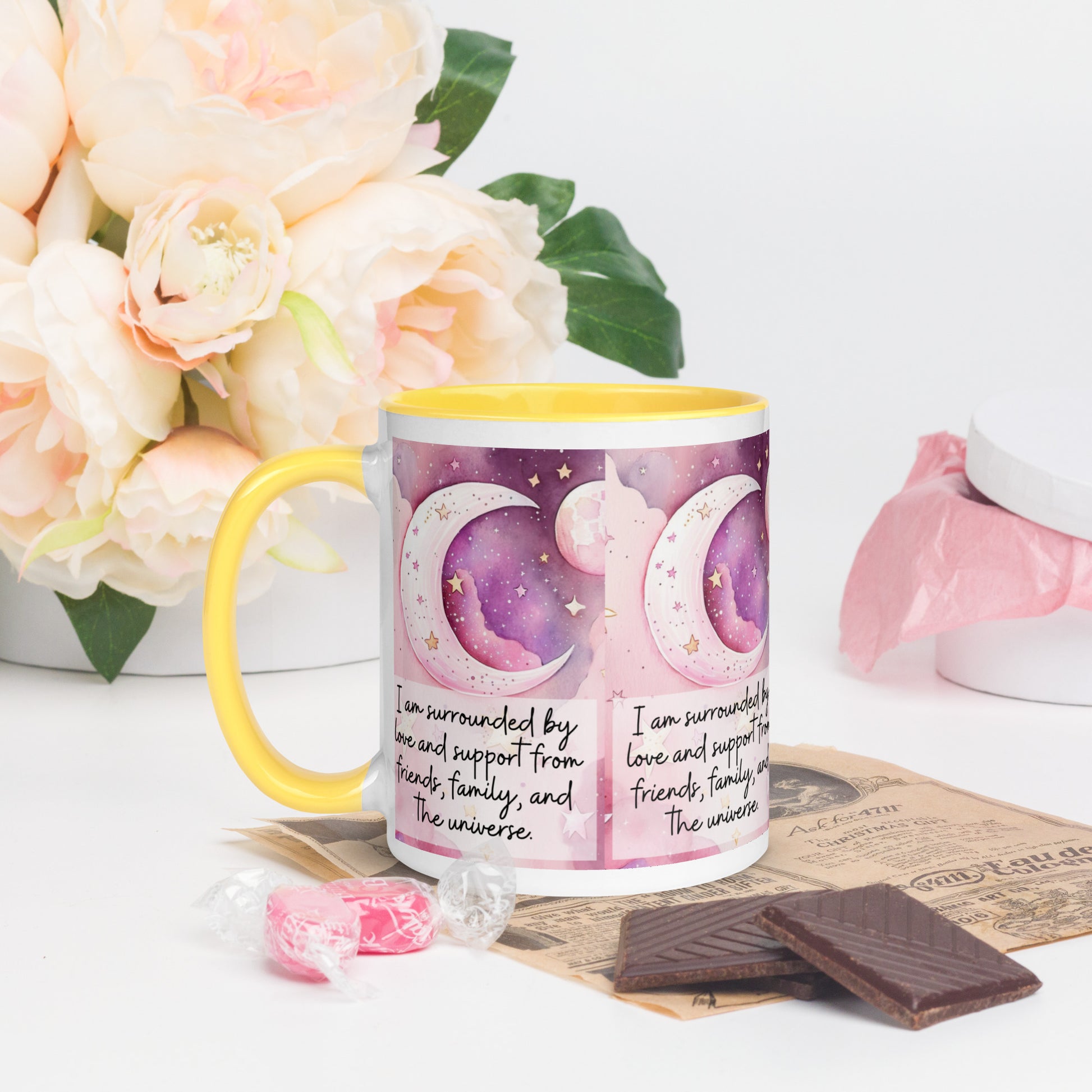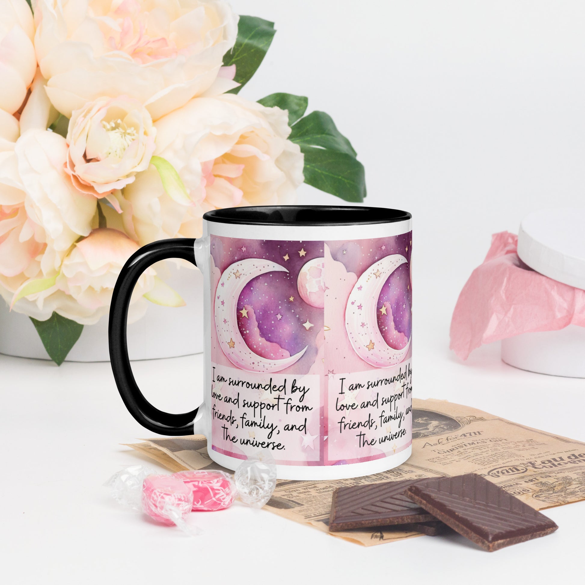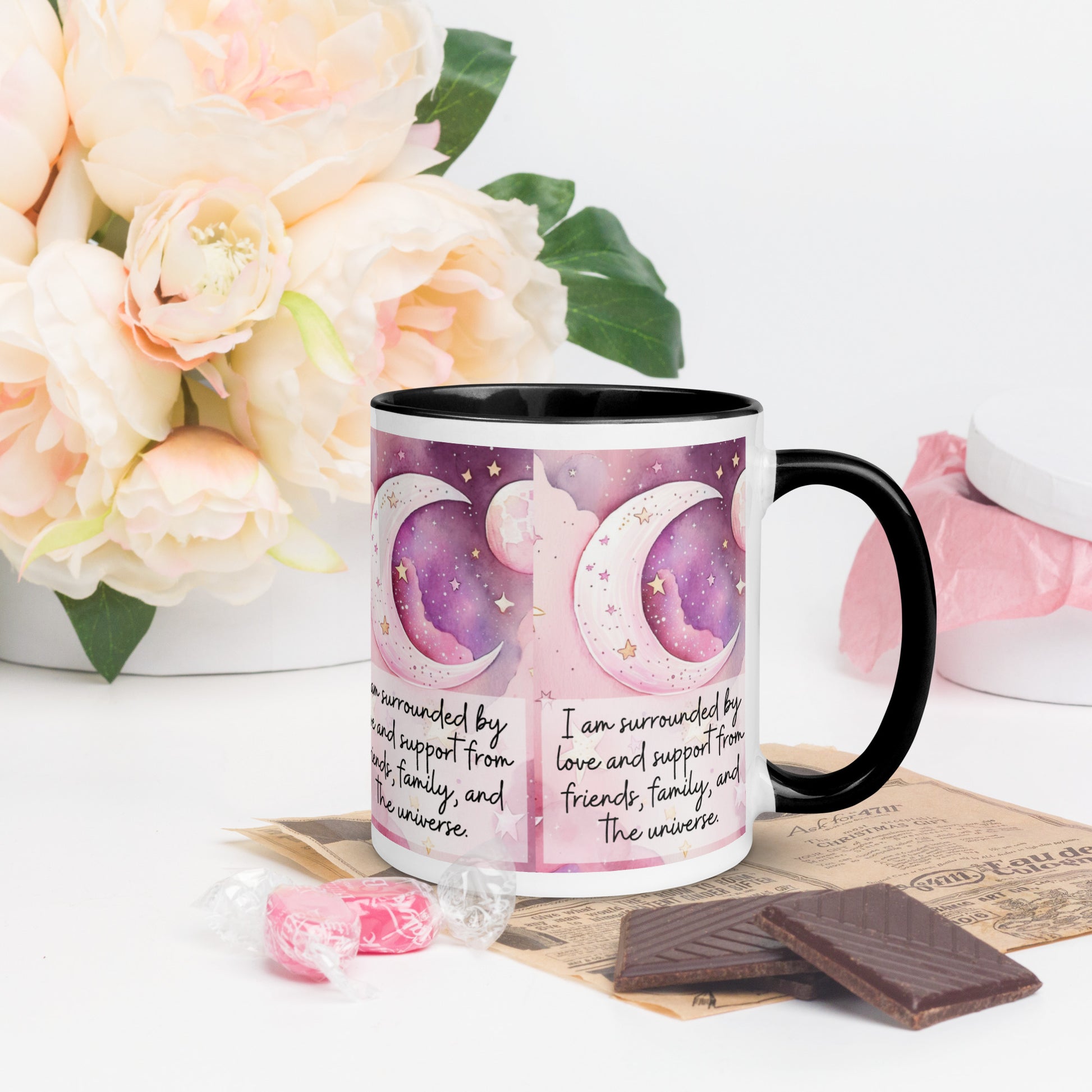Positivity Affirmation Mug with Color Inside, I am surrounded by love and support from friends, family, and the universe, pink moon, stars, night sky