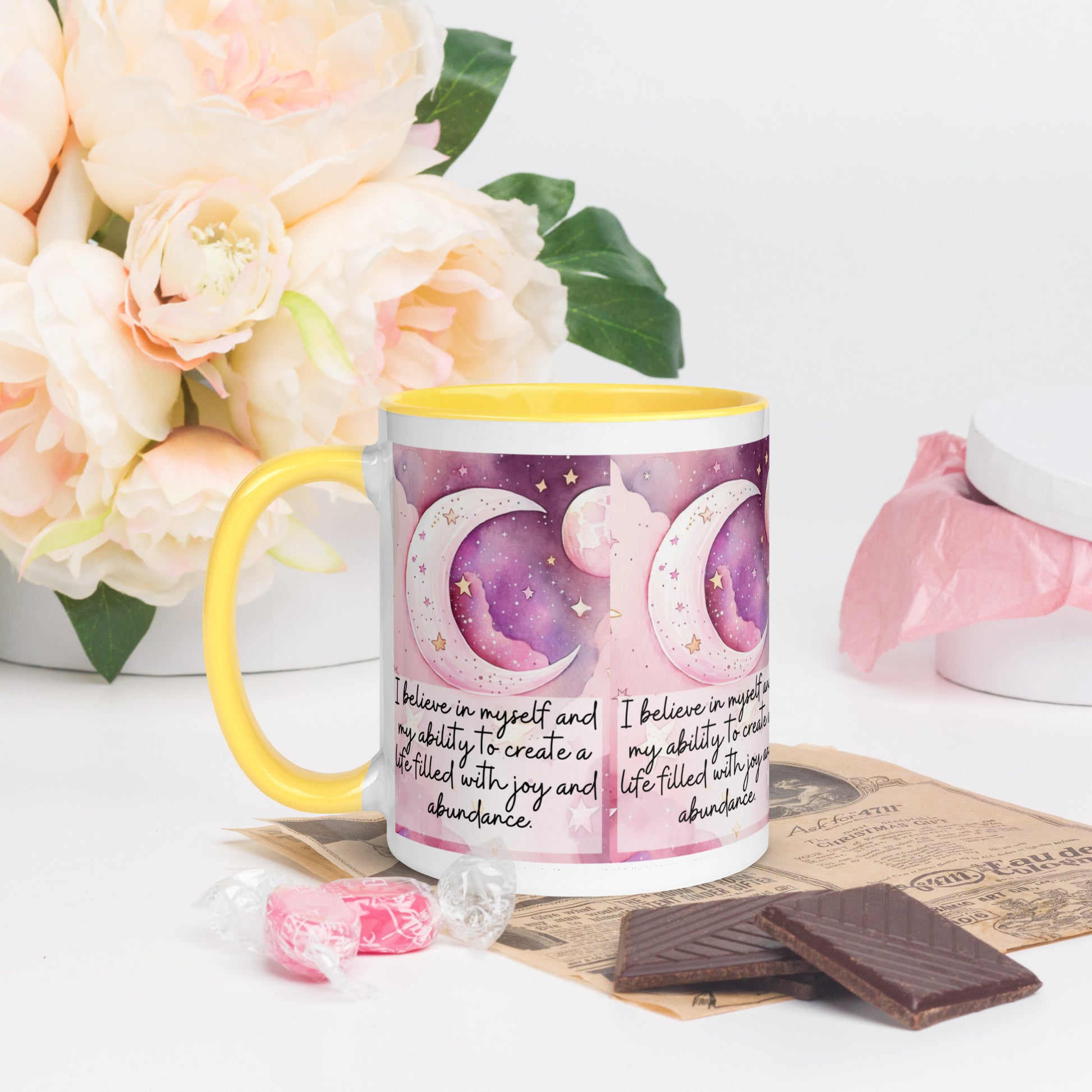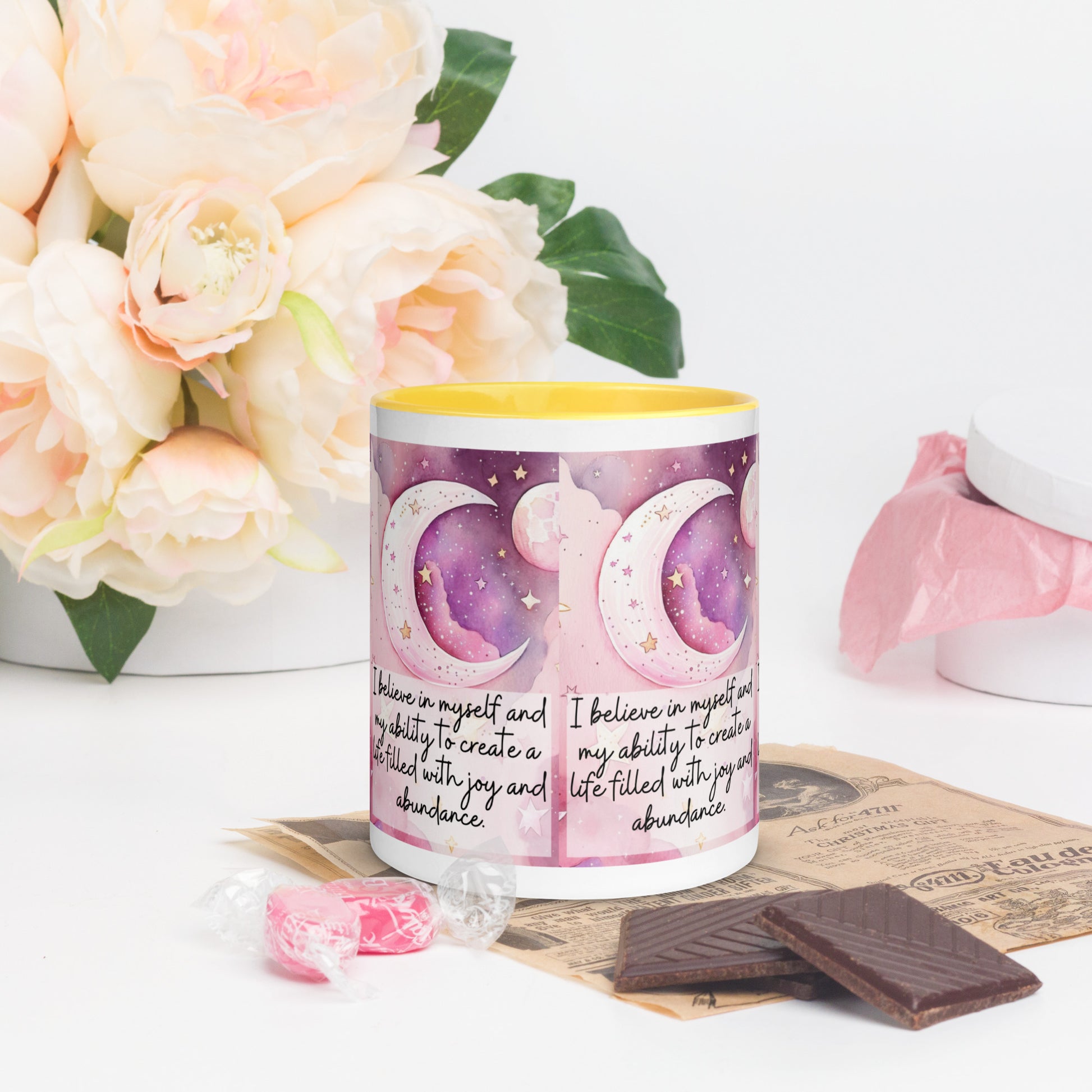 Positivity Affirmation Mug with Color Inside, I believe in myself and my ability’ to create a life filled with joy and abundance, pink moon, stars, night sky