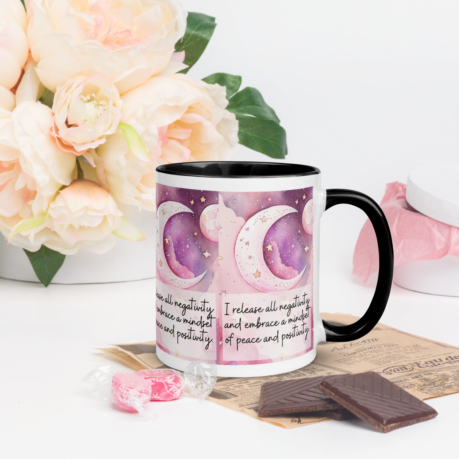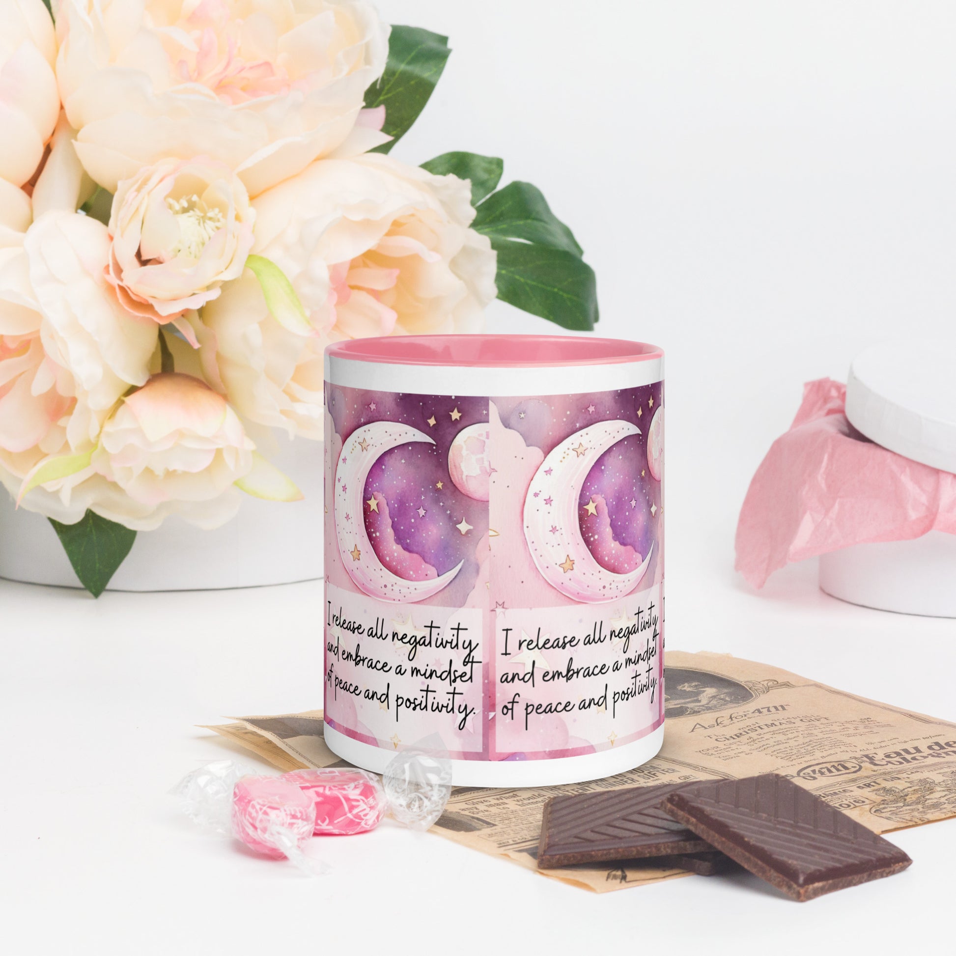 Positivity Affirmation Mug with Color Inside, I release all negativity and embrace a mindset of peace and positivity, pink moon, stars, night sky