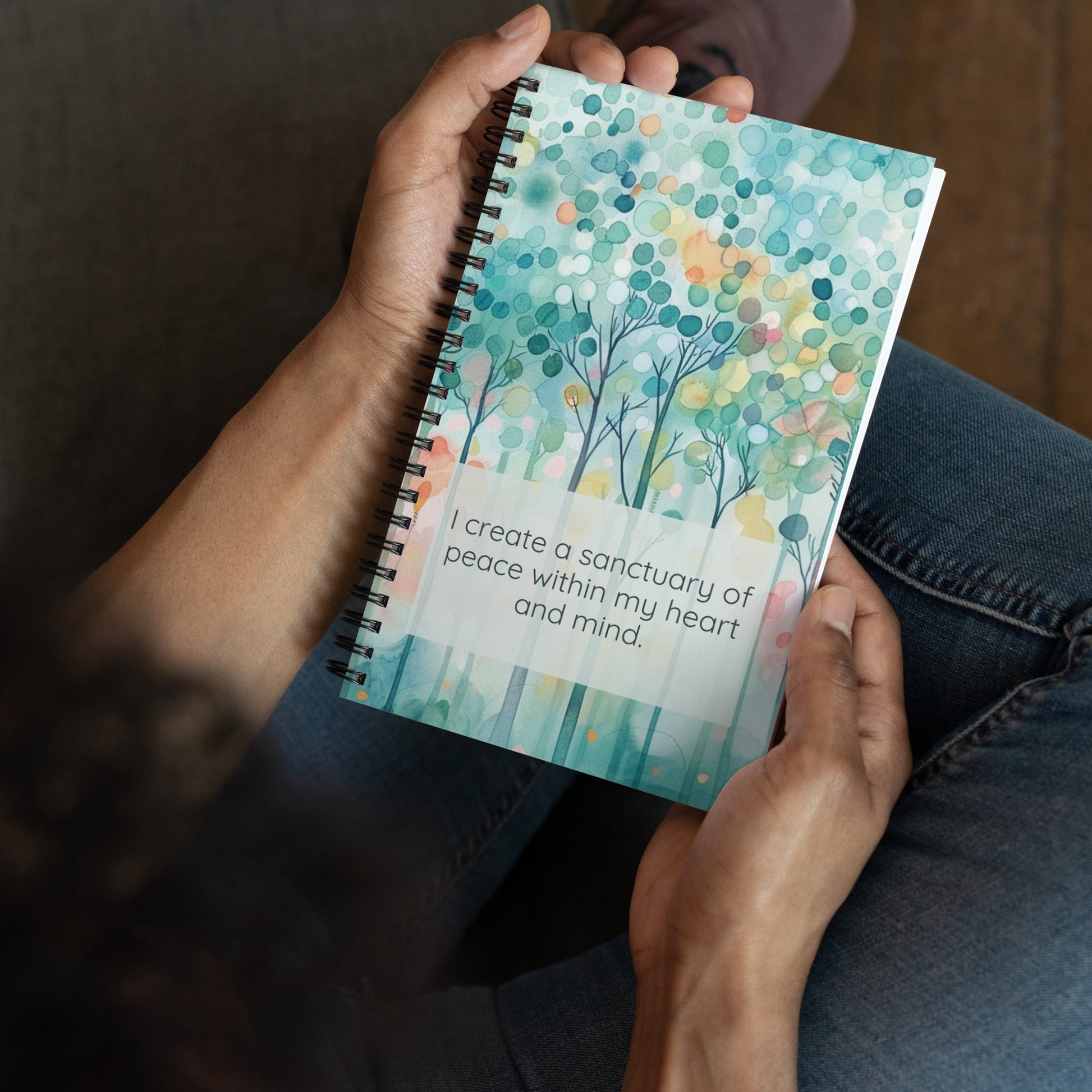 Peaceful Intentions Affirmation spiral notebook, "I create a sanctuary of peace within my heart and mind.”, 140 dotted pages