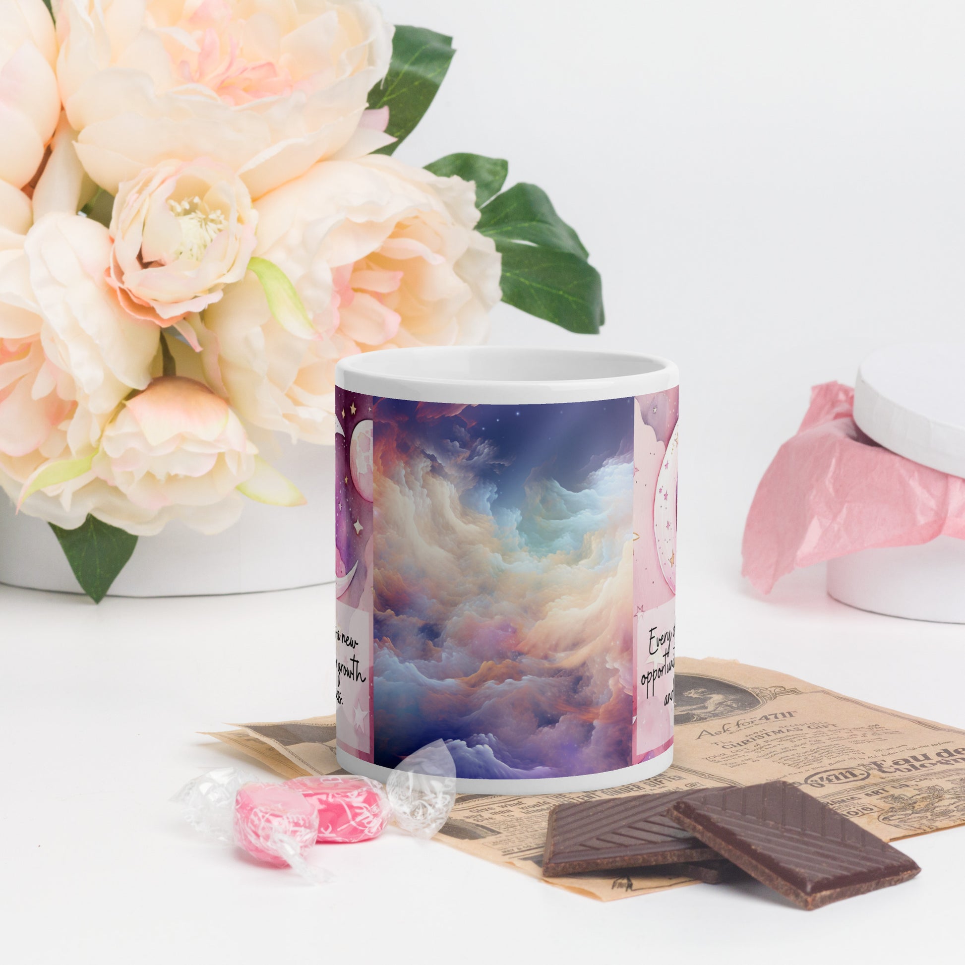 Positivity Affirmation White glossy mug, Everyday is a new opportunity for growth and success, pink moon, stars, night sky, 11oz