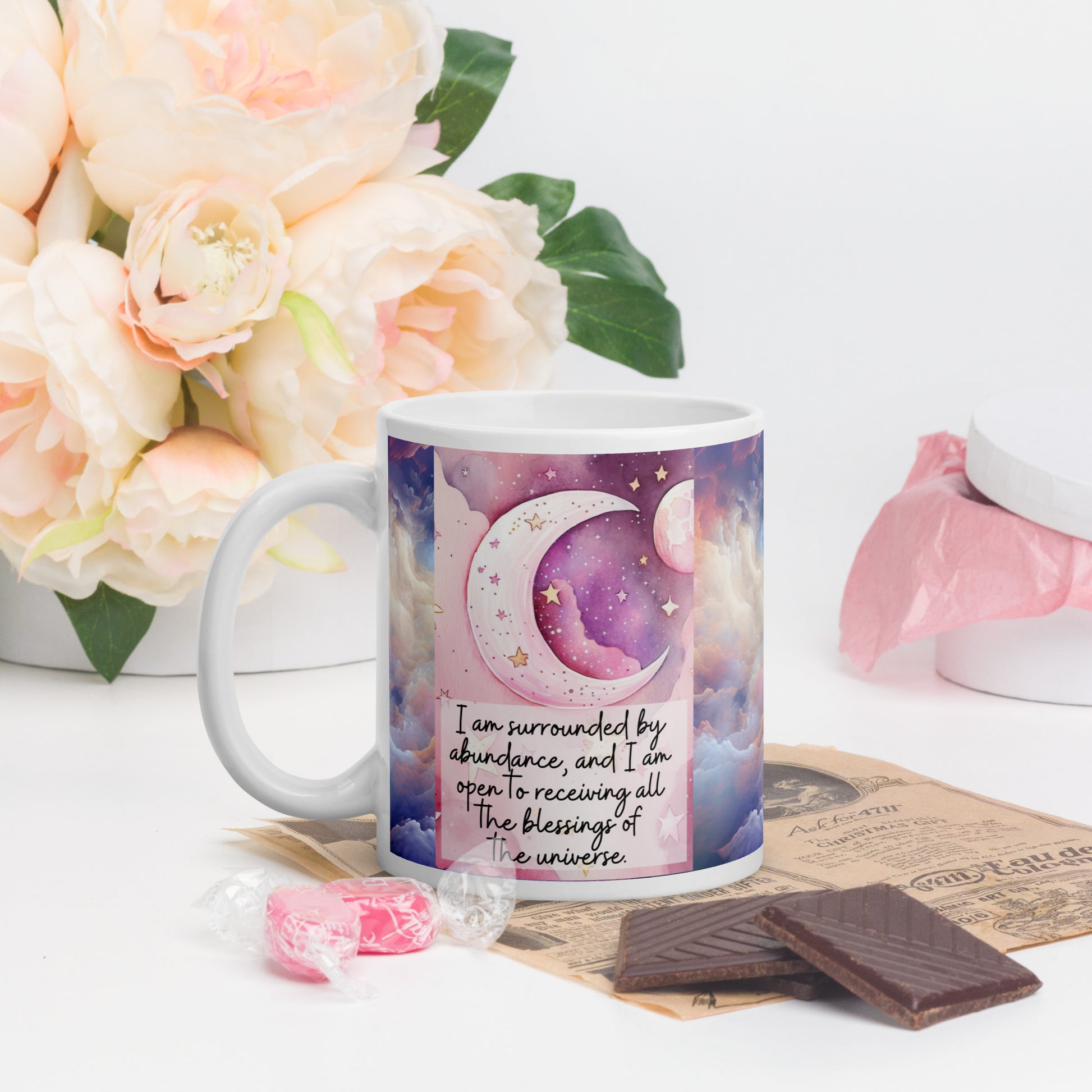 Positivity Affirmation White glossy mug, I am confident, pink moon, stars, night sky, 11oz
