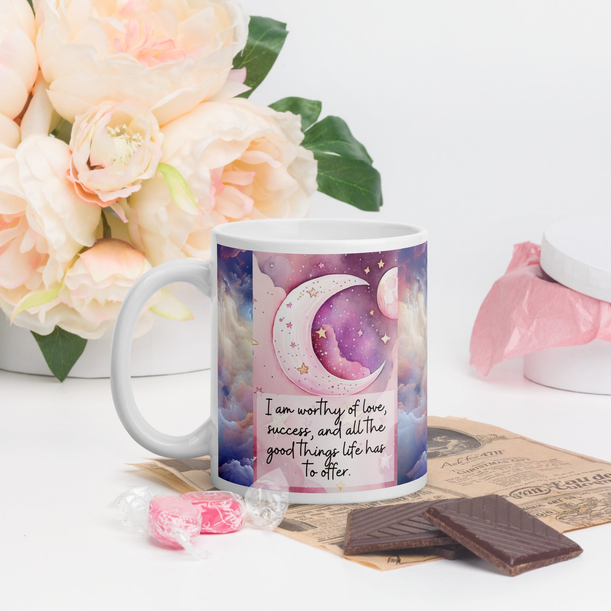 Positivity Affirmation White glossy mug, I am worthy of love, success and all the good things life has to offer, pink moon, stars, night sky, 11oz