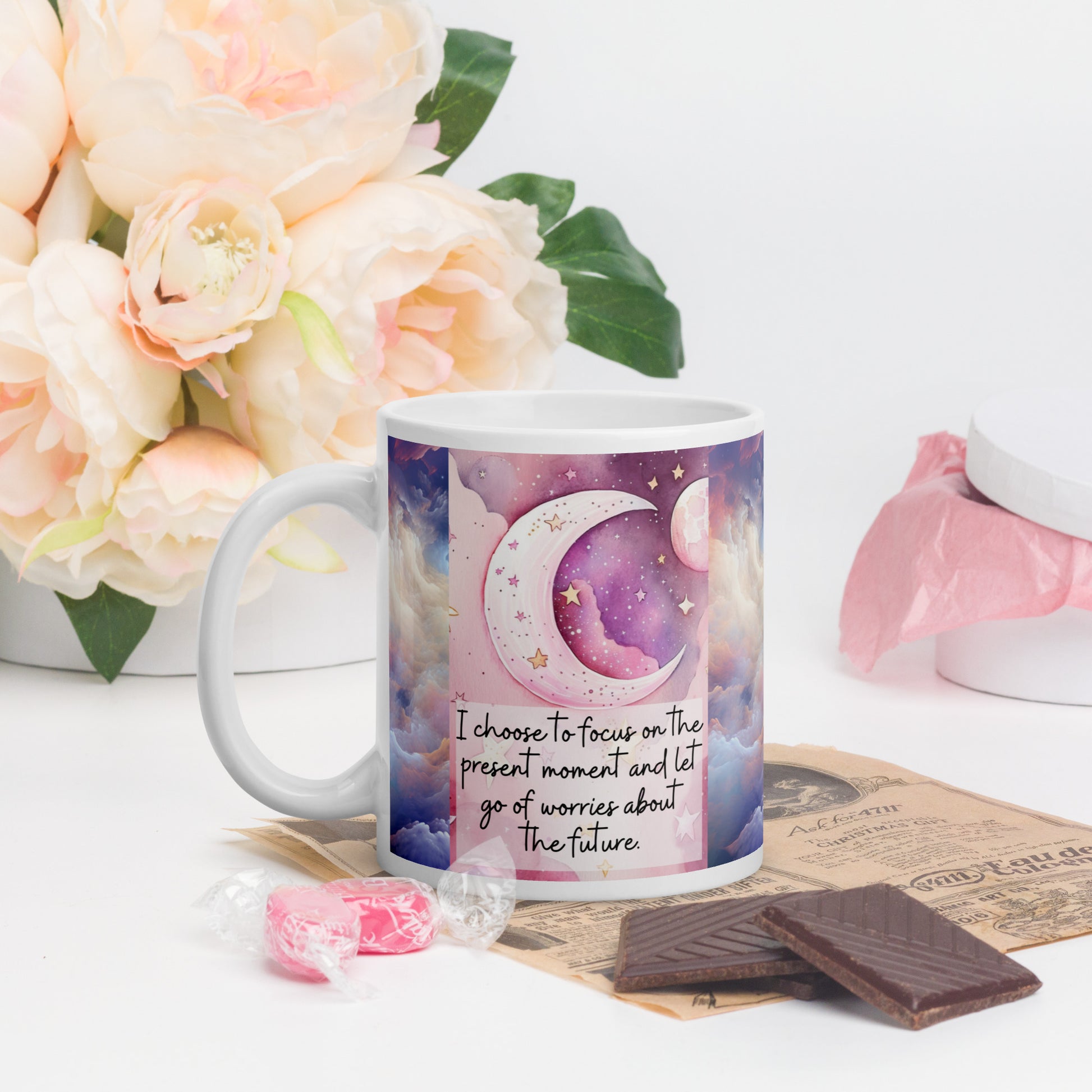 Positivity Affirmation White glossy mug, I radiate positivity and attract good things into my life, pink moon, stars, night sky, 11oz