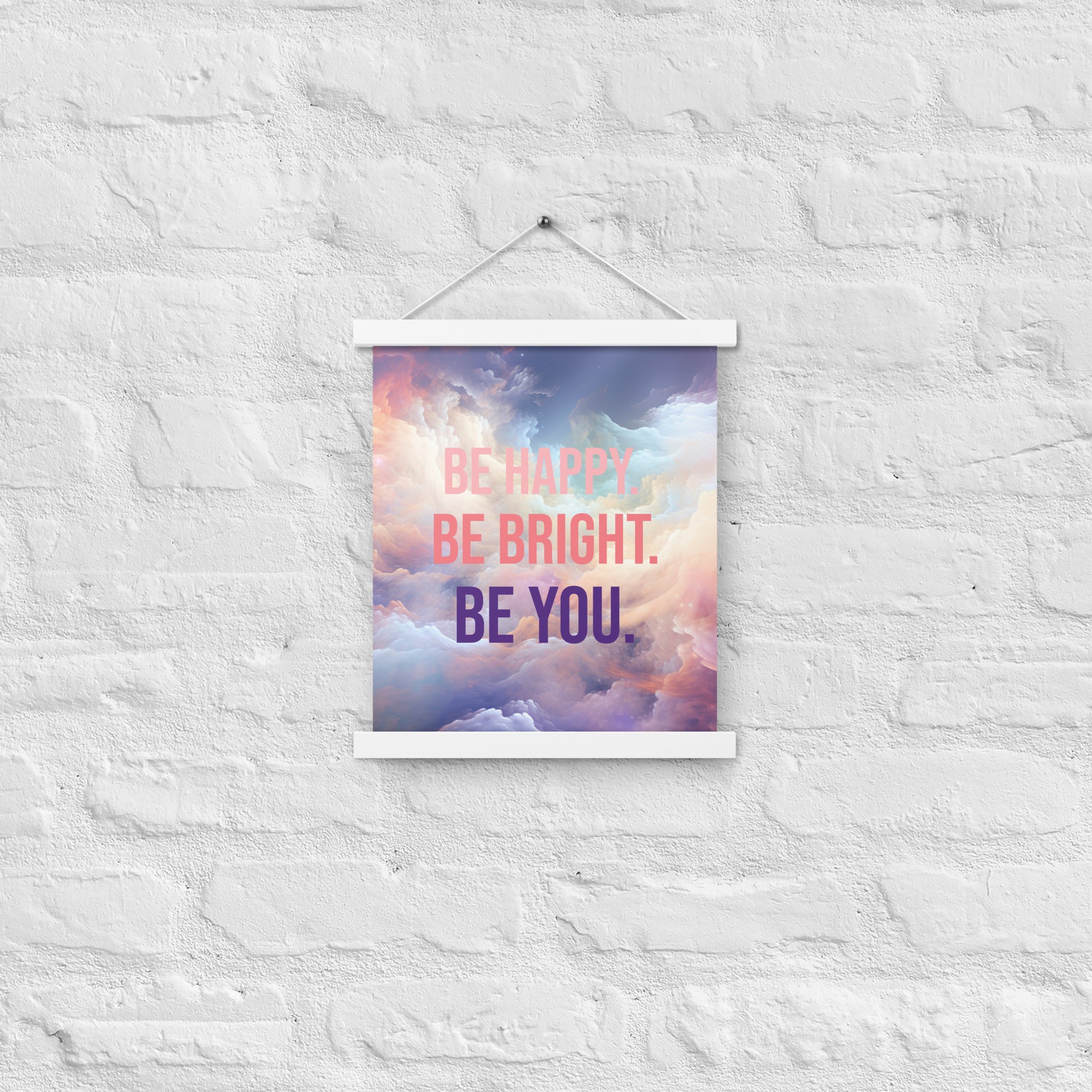 Poster with hangers, be bright, be happy, be you text on background of soft colorful clouds