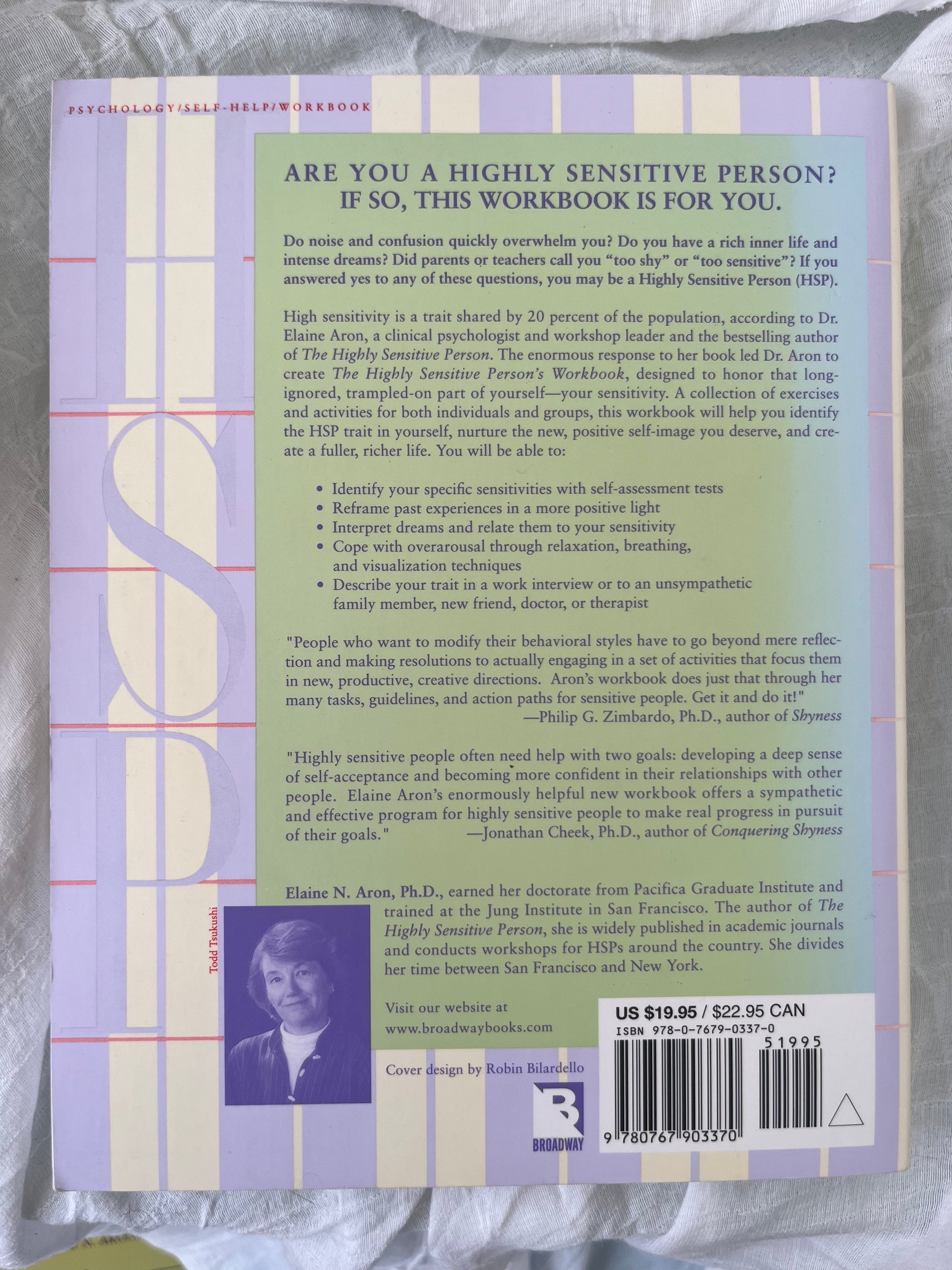 Elaine Aron, a clinical psychologist and workshop leader and the bestselling author of The Highly Sensitive Person. The enormous response to her book led Dr. Aron to create The Highly Sensitive Person's Workbook, designed to honor that long-ignored, trampled-on part of yourself-your sensitivity. A collection of exercises and activities for both individuals and groups, this workbook will help you identify the HSP trait in yourself, nurture the new, positive self-image you deserve, and create a fuller, richer life. You will be able to: