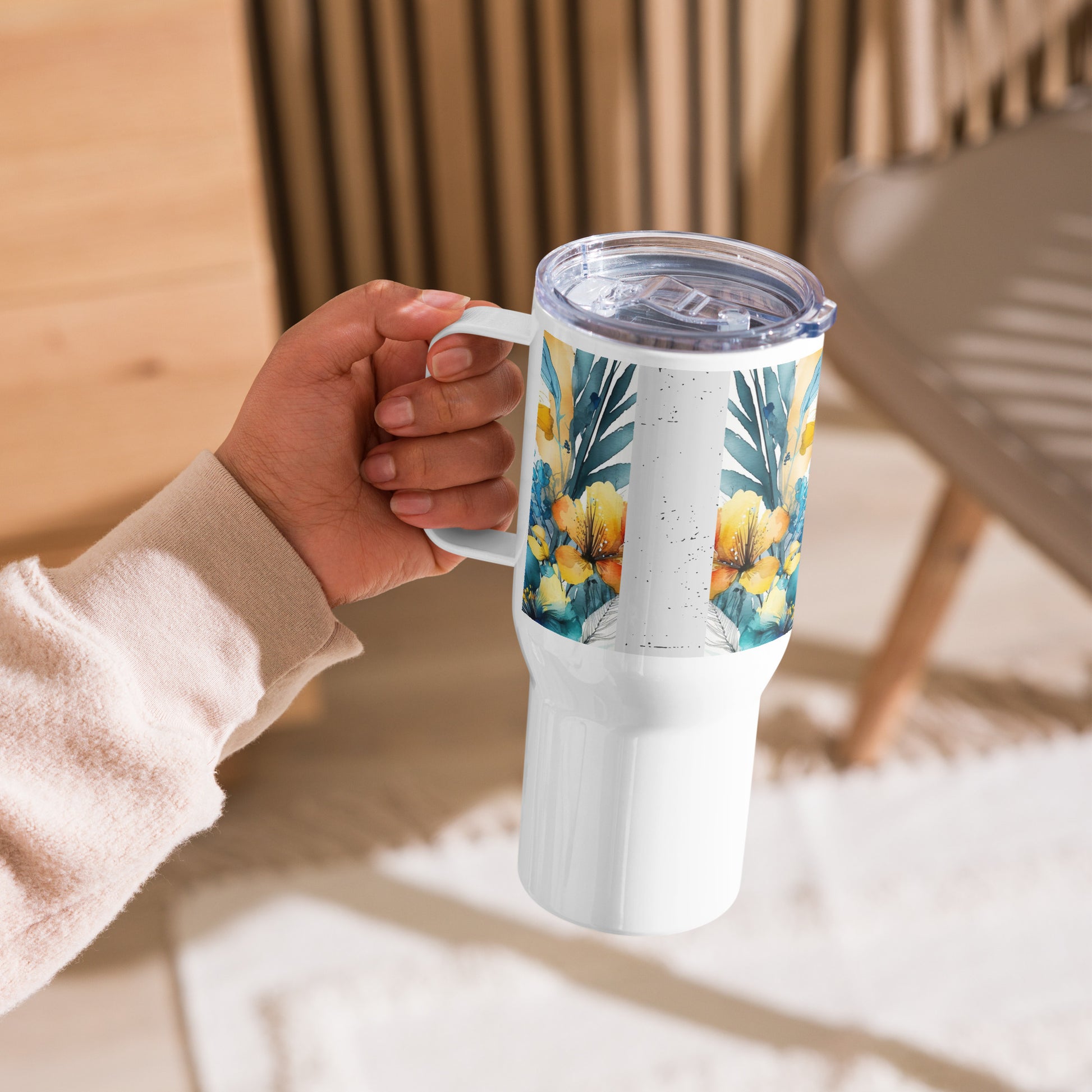 Travel mug with a handle, bright floral design, pinks and purples, elegant, fun